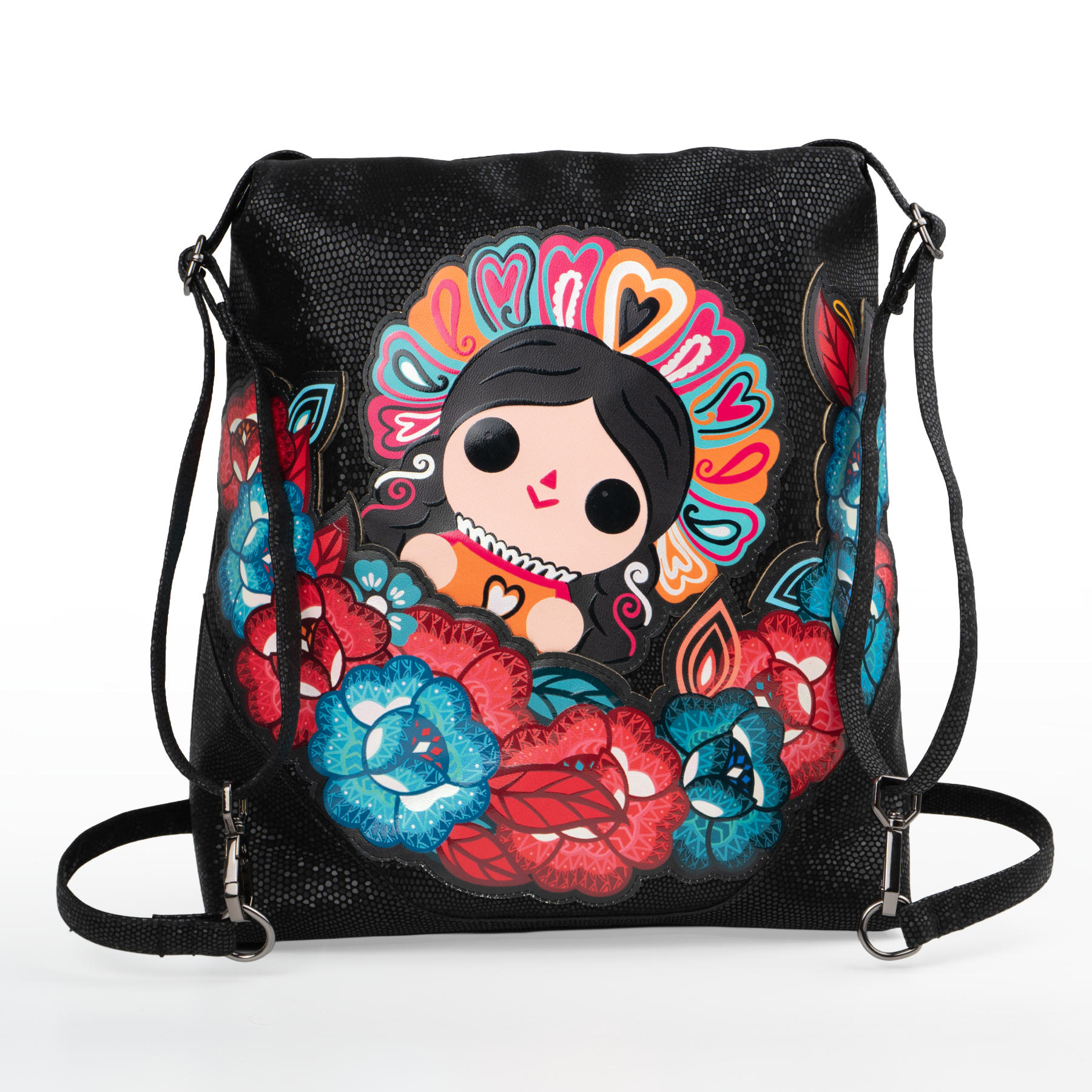Bolsa con diseño inspirado en los bordados textiles presentes en los trajes típicos que tiene como protagonista a Petrita, nuestra reinterpretación de la muñeca mazahua.