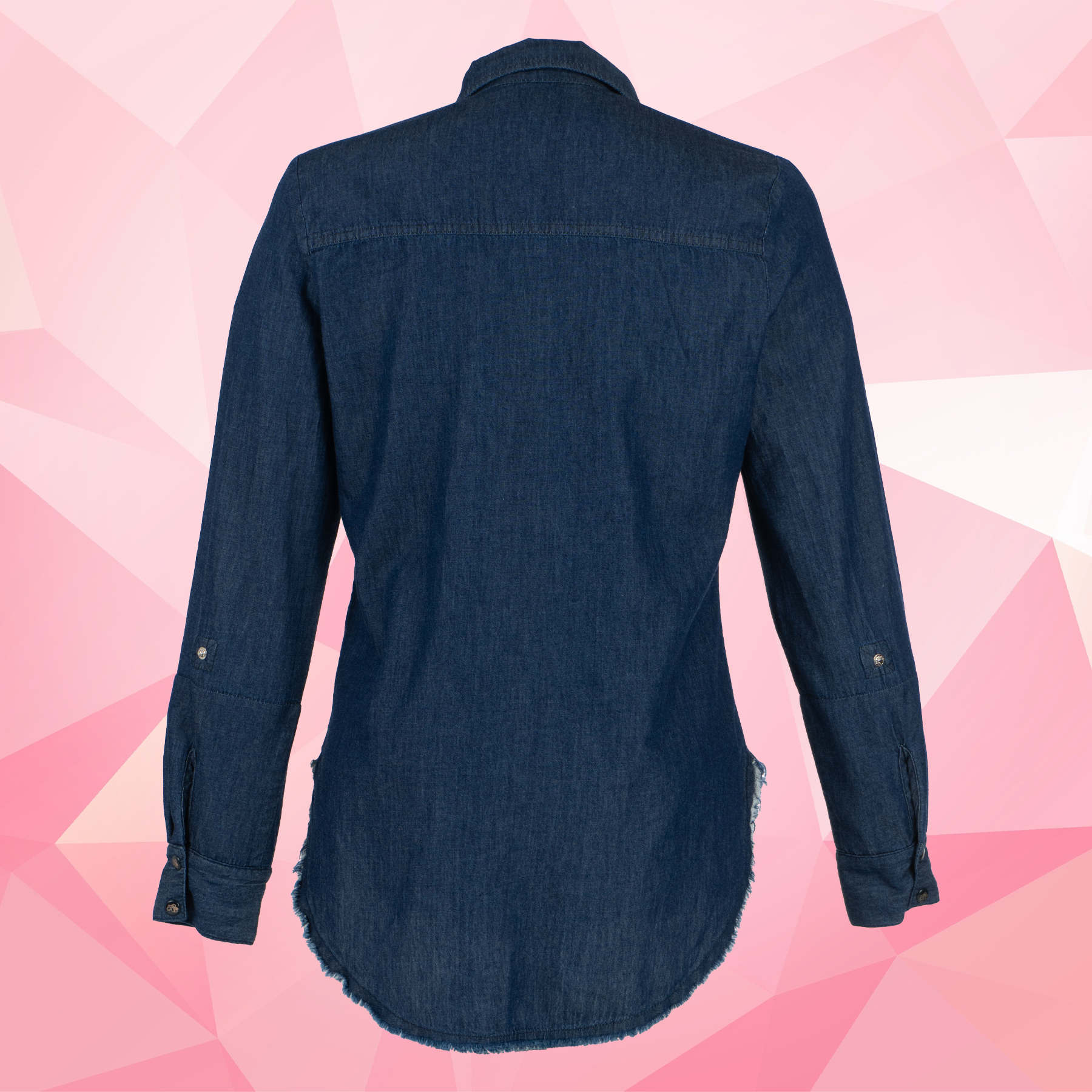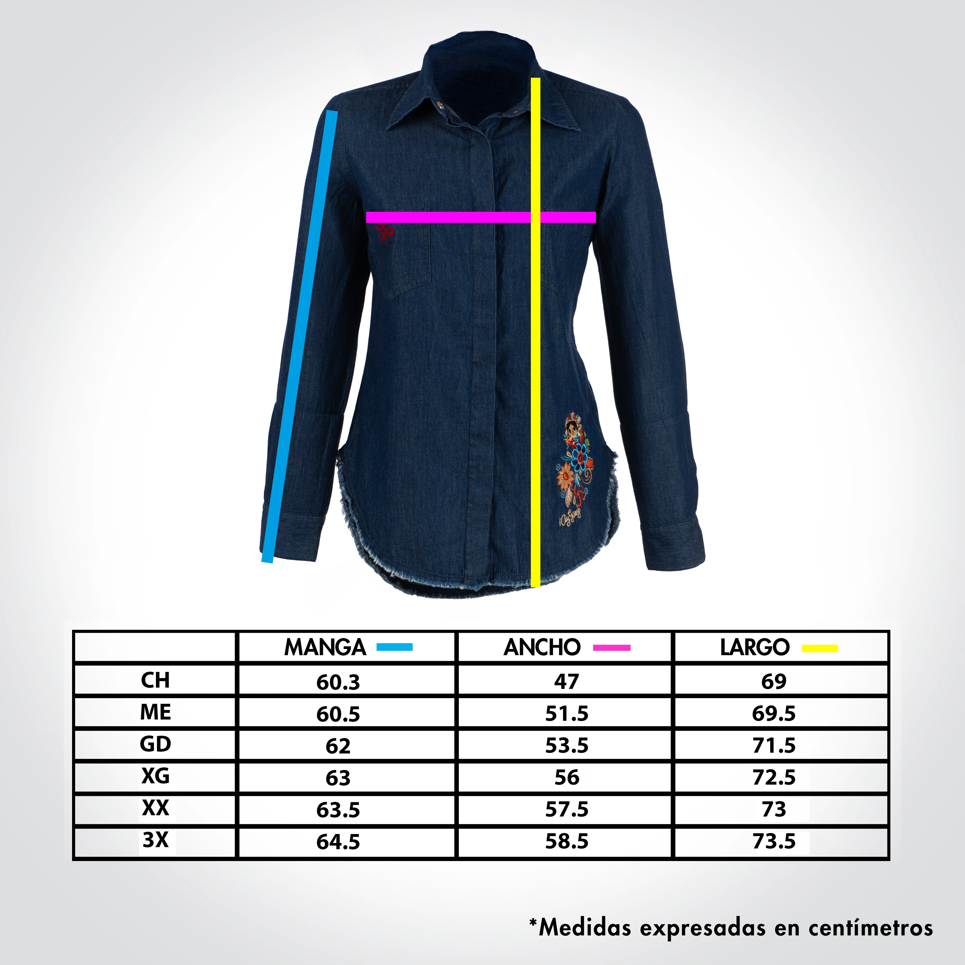 ¡Viste con estilo! Esta camisa de mezclilla cuenta con manga larga y un diseño interior estampado en sublimación. Además, presenta detalles bordados en el costado para un toque aún más elegante. ¡Hazte con ella y roba todas las miradas!