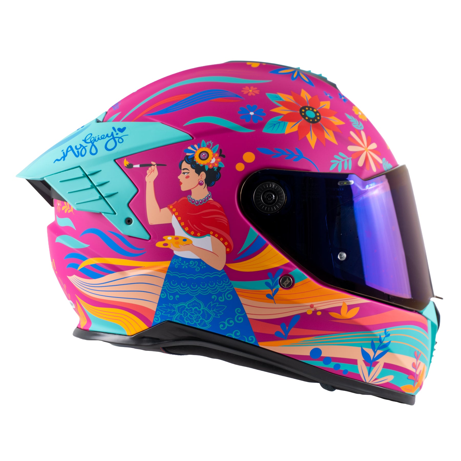 Los gráficos son homenaje a la representación artística de una pintora, capturada en un momento de inspiración y creatividad. Este detalle, que celebra el talento femenino y el arte mexicano, convierte a este casco en una declaración de estilo y un homenaje a la pasión por la pintura y la velocidad.