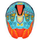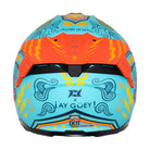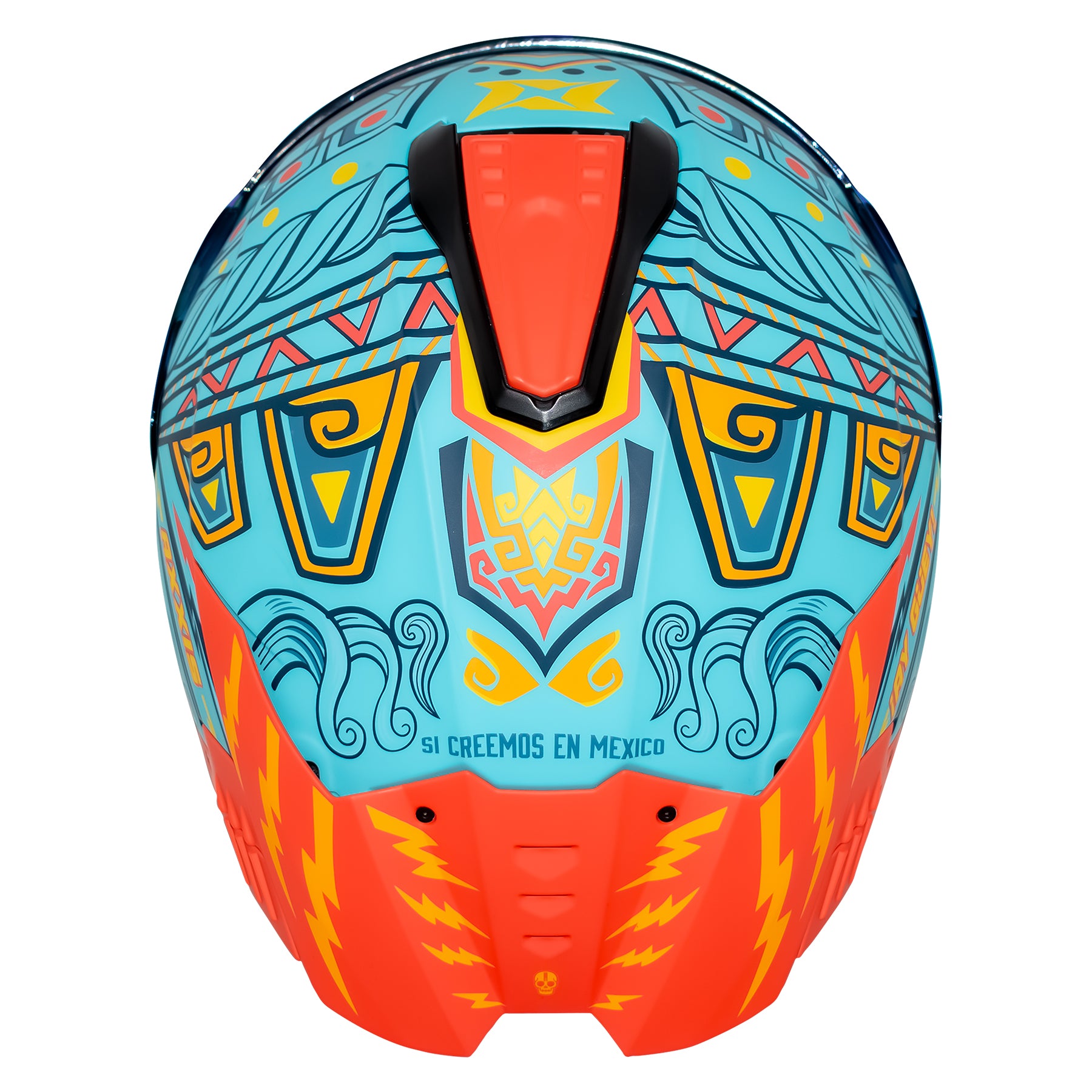 "Este casco es una oda al poderoso Tláloc, dios azteca de la lluvia, evoca las profundidades de un cielo prehispánico. Su base azul simboliza las aguas celestiales, mientras que intrincados motivos prehispánicos en tonos amarillos y naranjas representan los rayos solares que desencadenan las tormentas. Un rostro estilizado del dios, con sus características facciones, adorna la parte frontal, recordándonos su dominio sobre los elementos naturales."