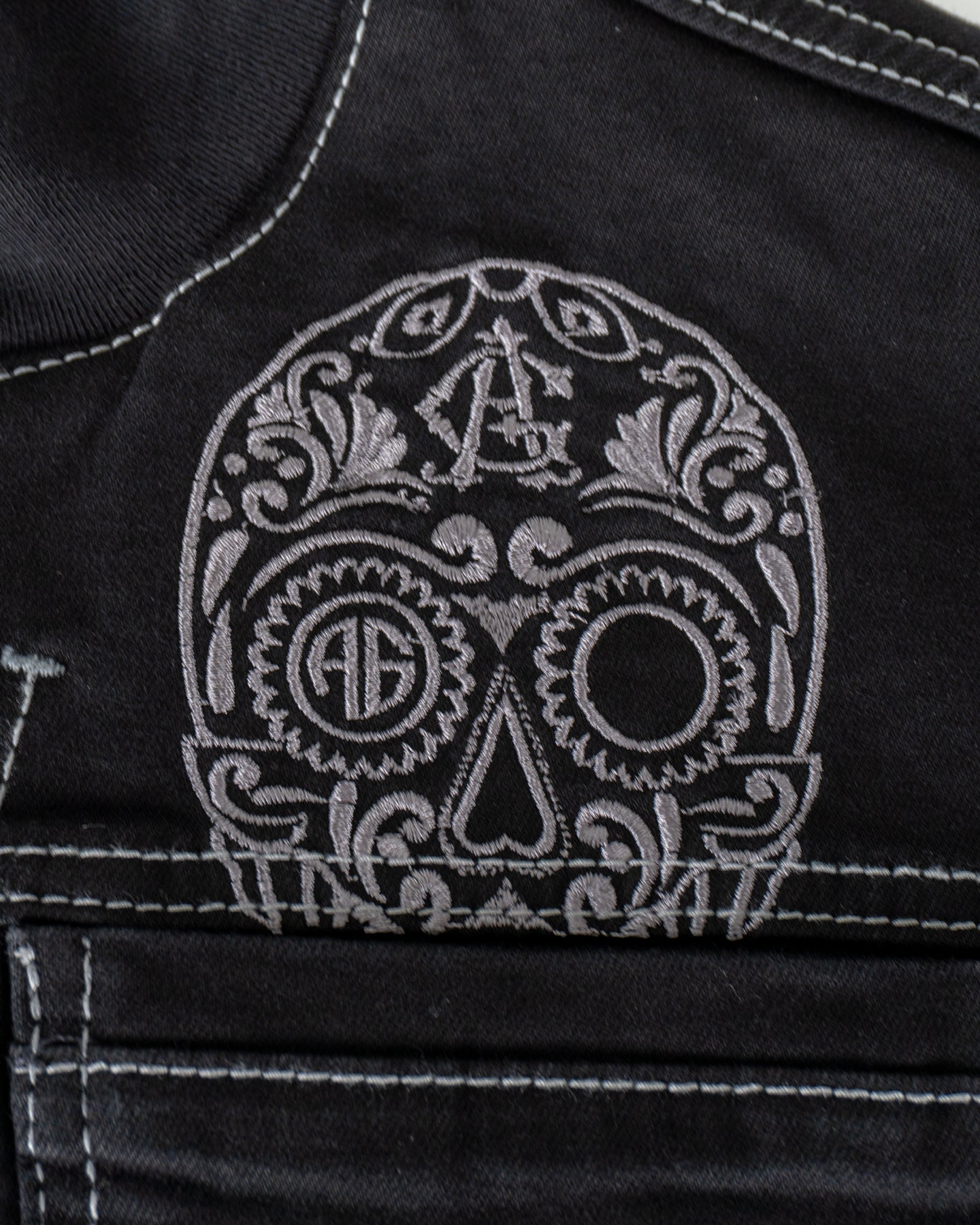 Bordado en relieve de calavera de azúcar en espalda.