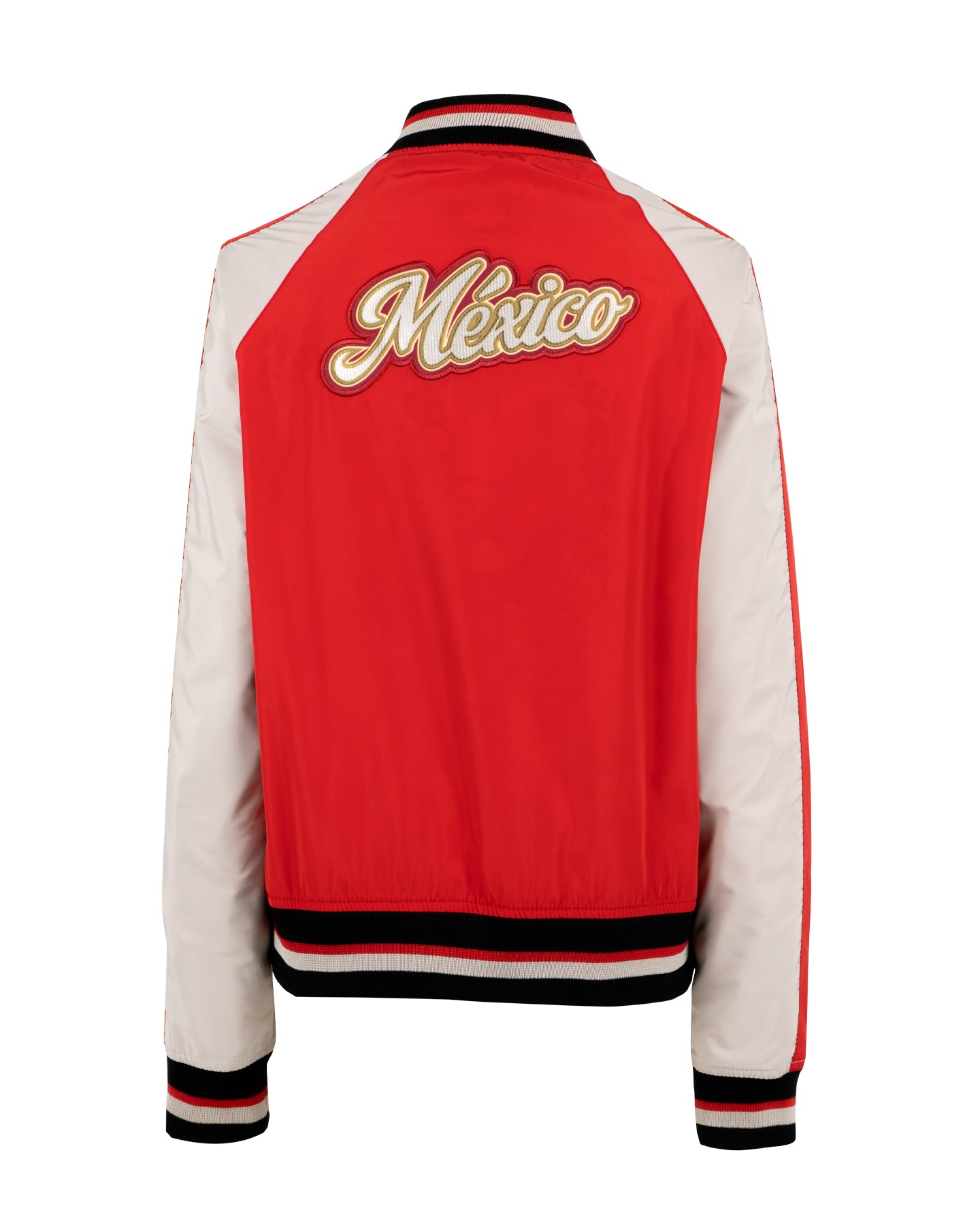 Estilo varsity en rojo intenso y mangas off-white. El reverso presenta la palabra "México" delicadamente bordada en hilo dorado, ofreciendo un look discreto pero elegante.