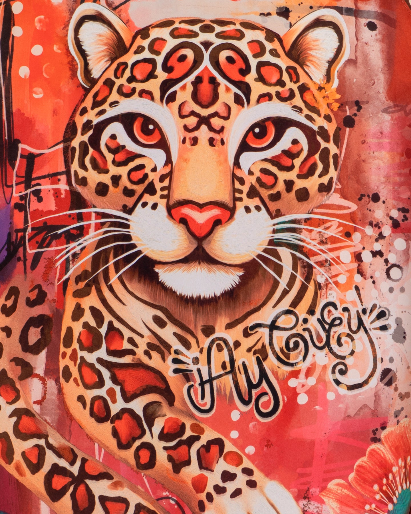 Estampado vibrante de un majestuoso jaguar (Balam) rodeado de motivos florales y botánicos en tonos shocking. Una explosión de glamour tropical y arte audaz.