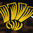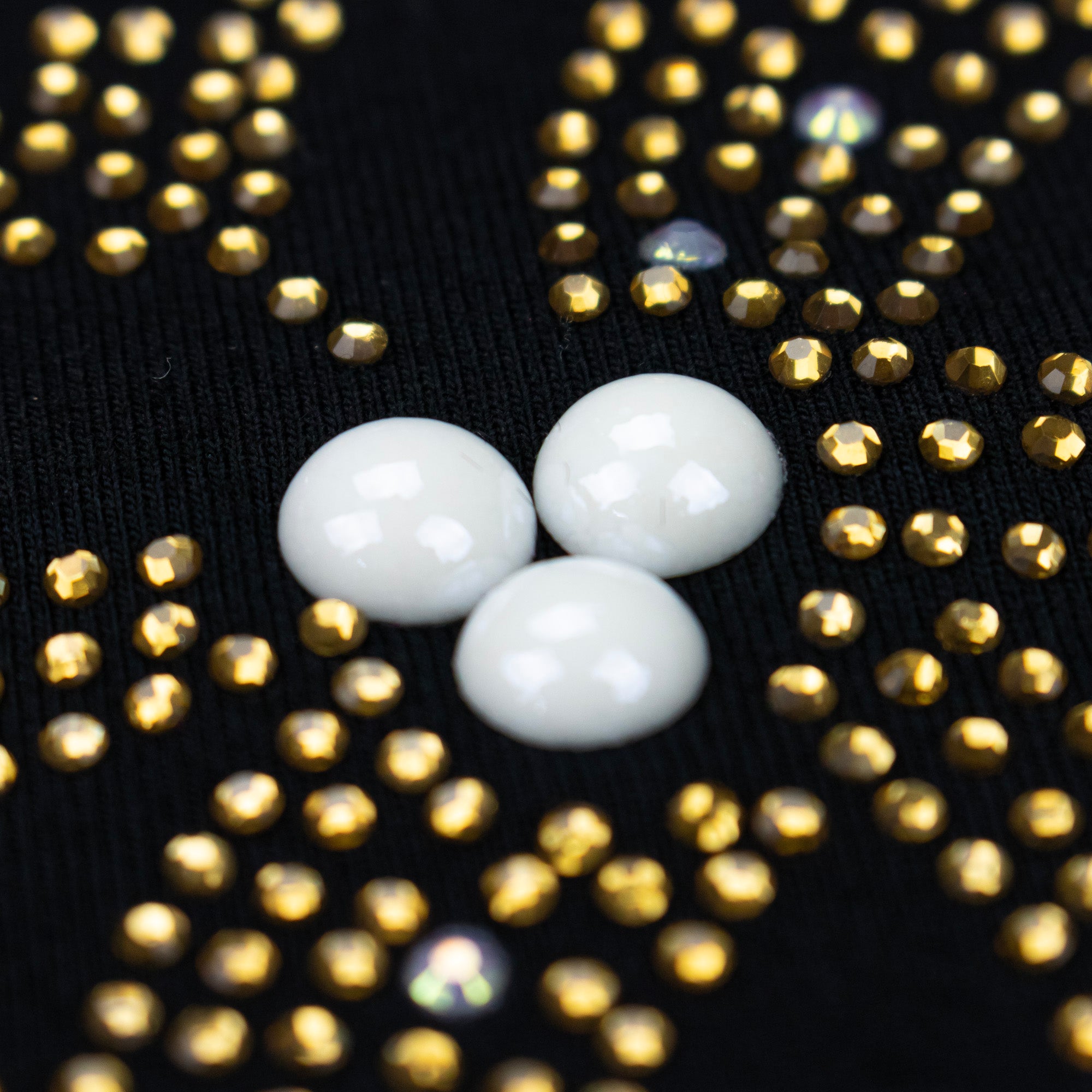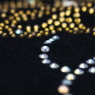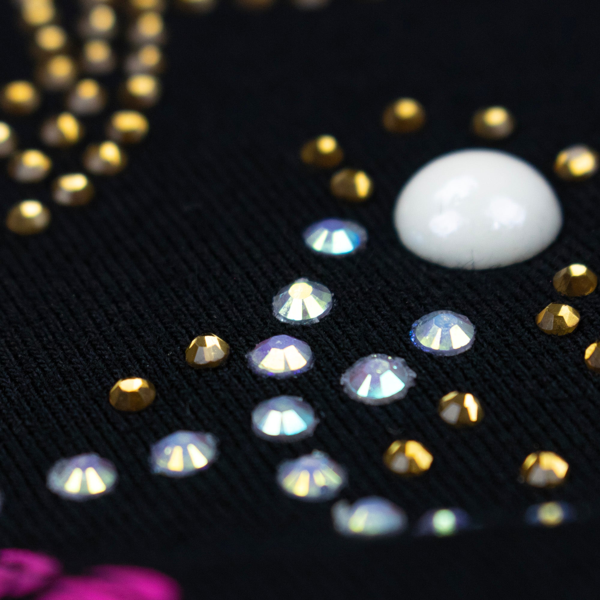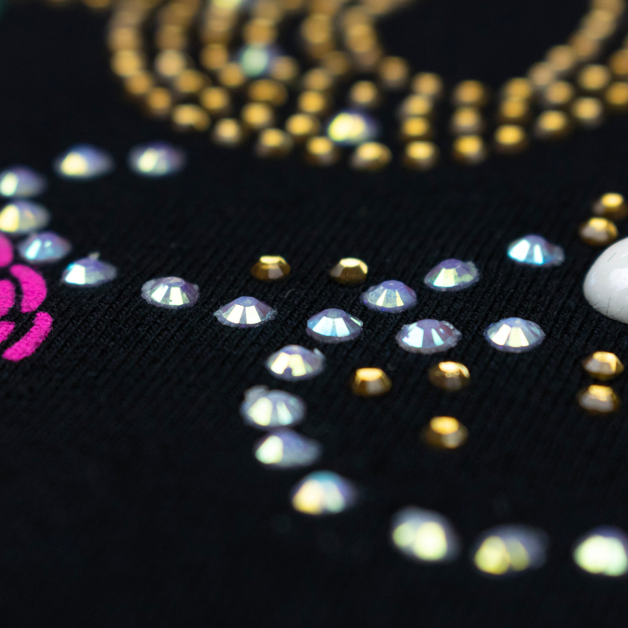 Cuenta con aplicación de pedrería tipo cristal y shimmer dorado con acabado adiamantado
