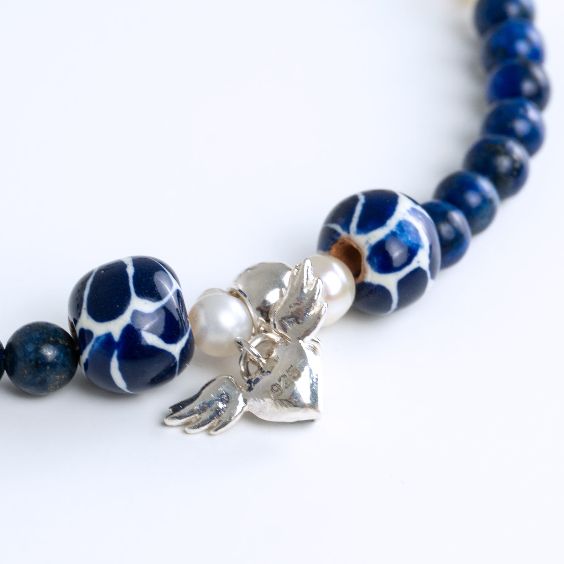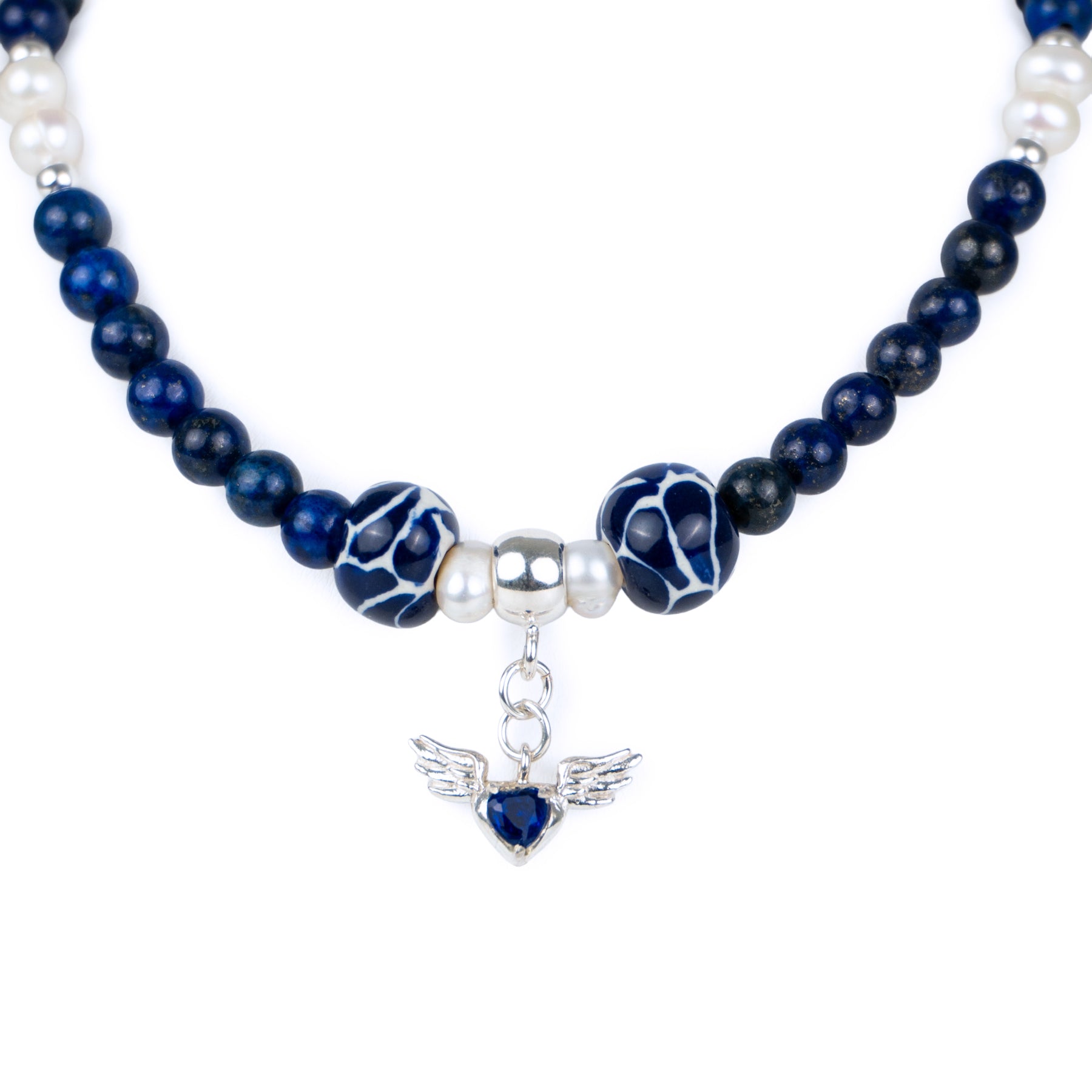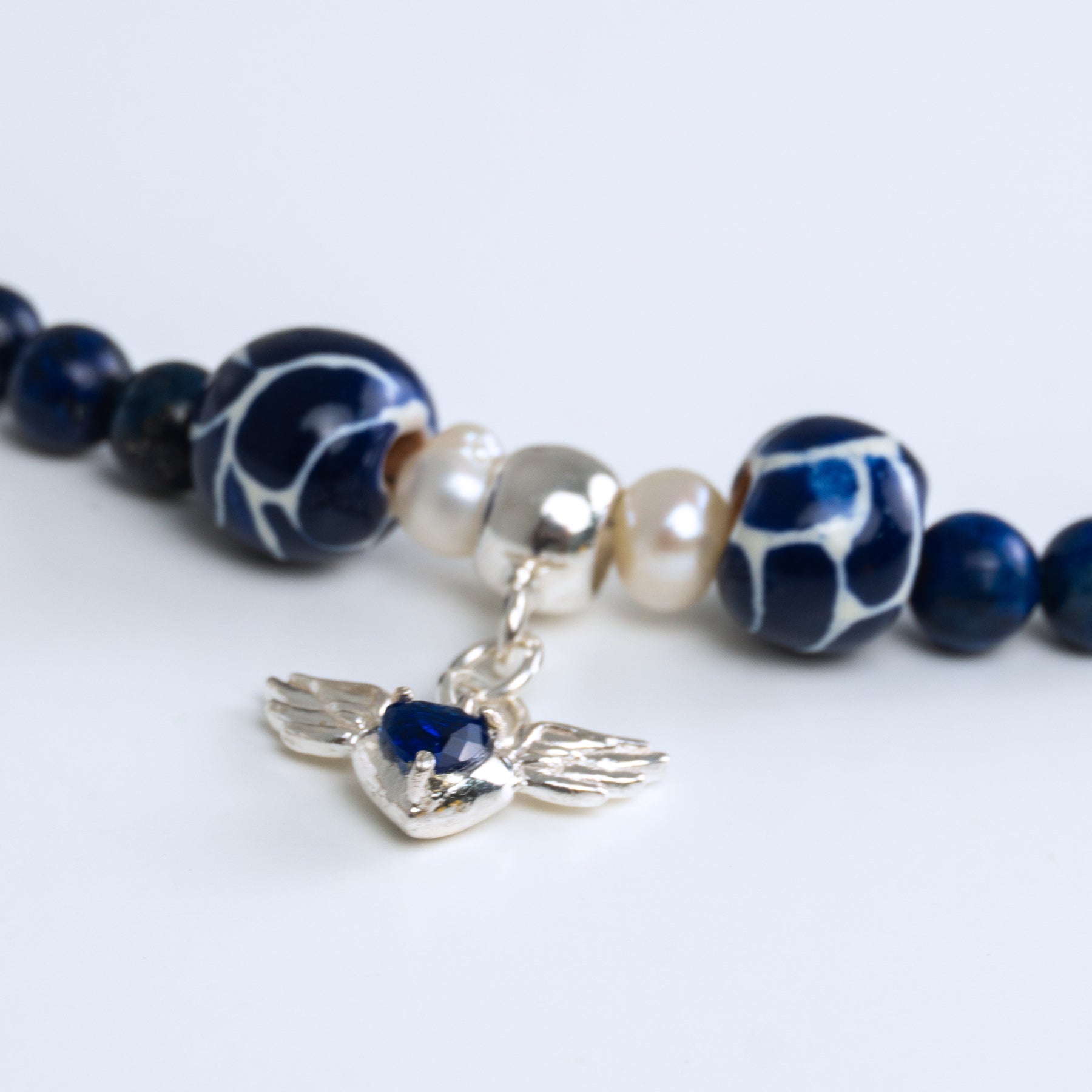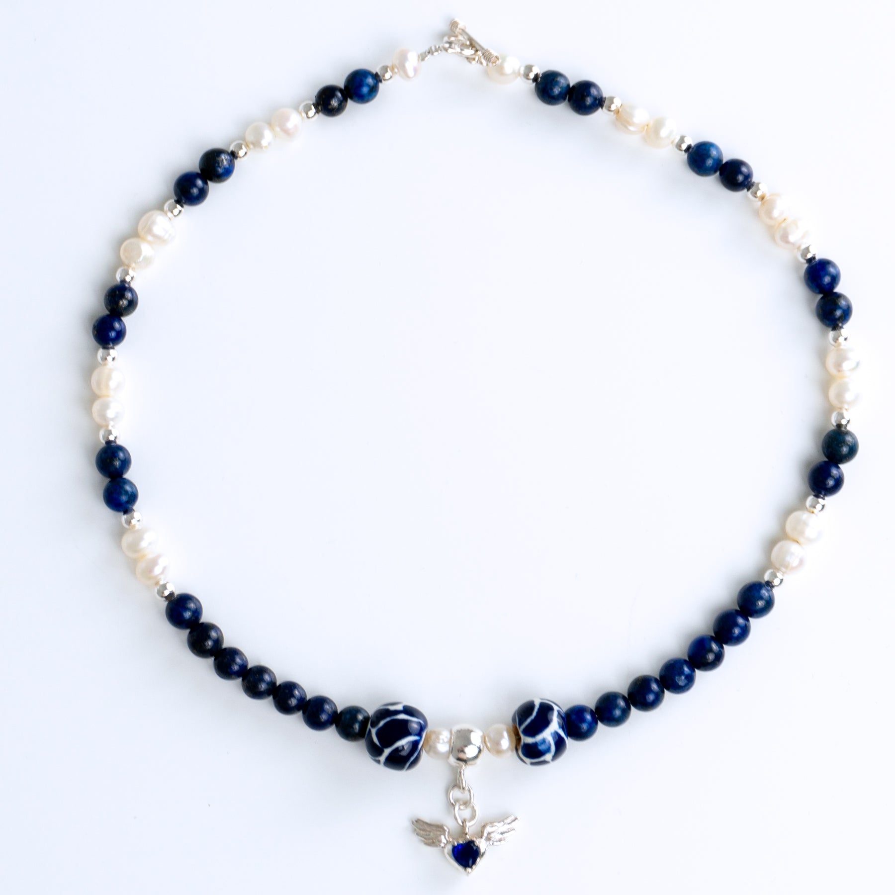 Collar elástico con cuentas de lapislázuli de color azul profundo y perlas naturales blancas. Incorpora una cuenta central de cerámica vidriada azul con vetas blancas y un dije colgante de plata con forma de corazón alado.