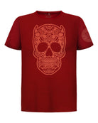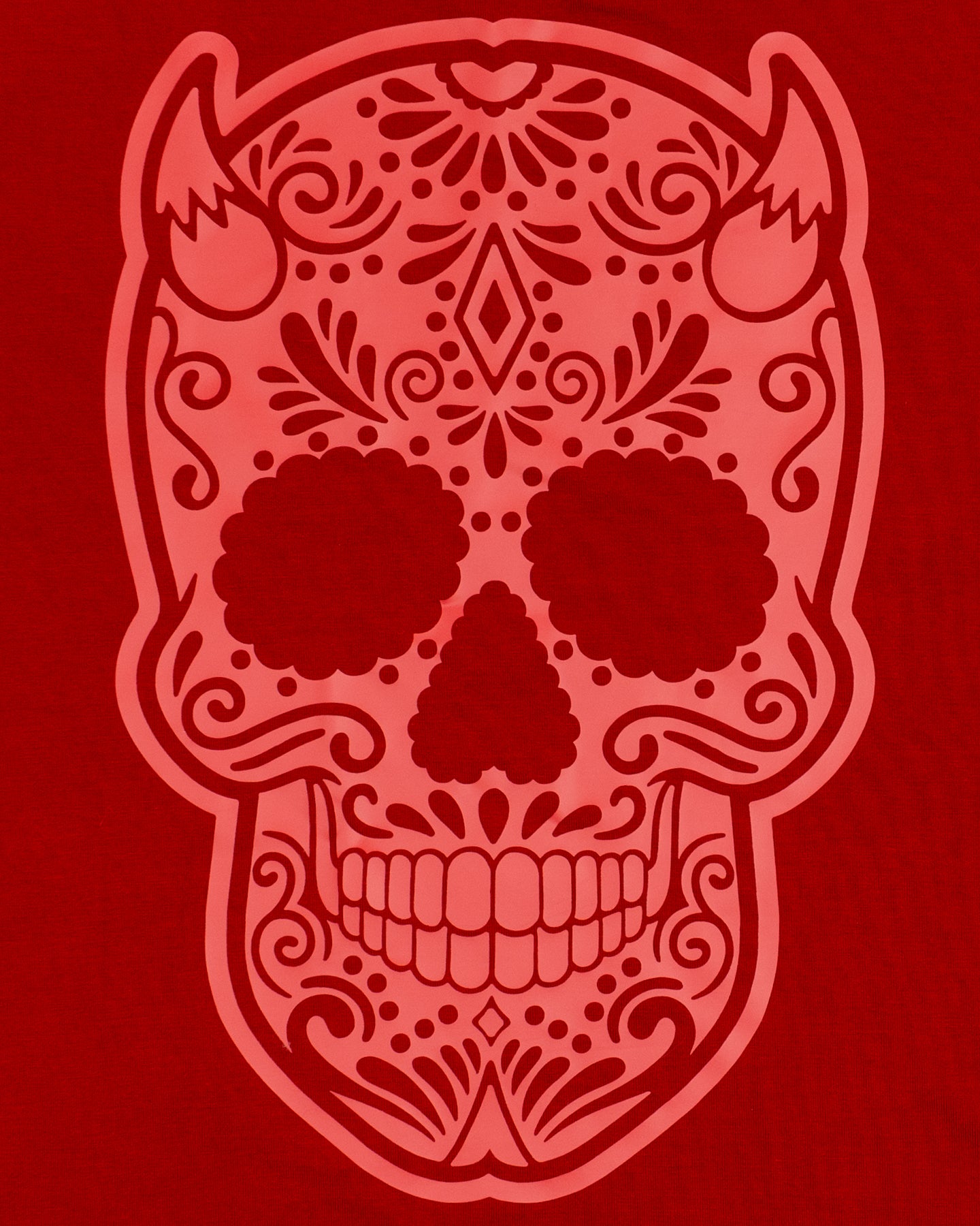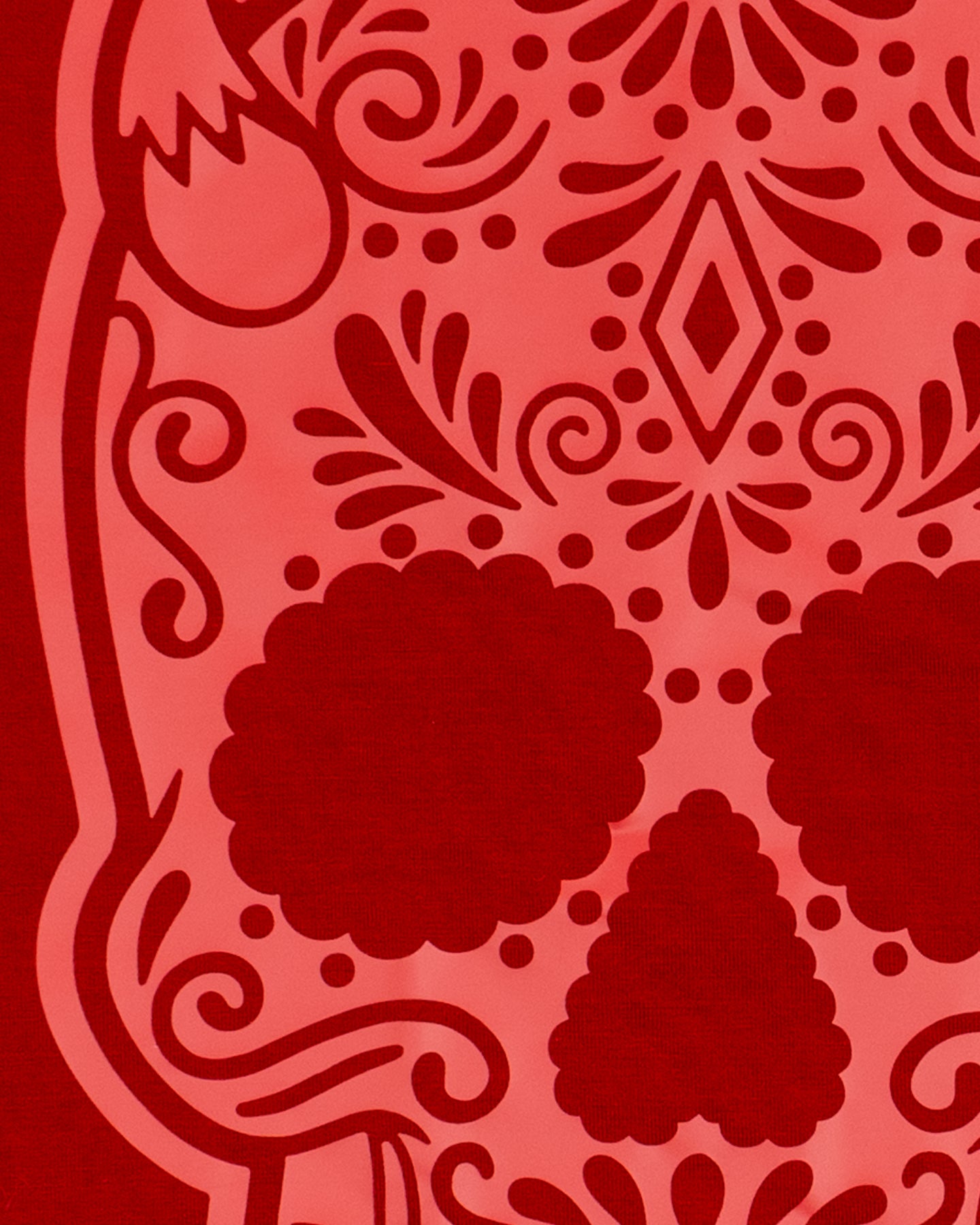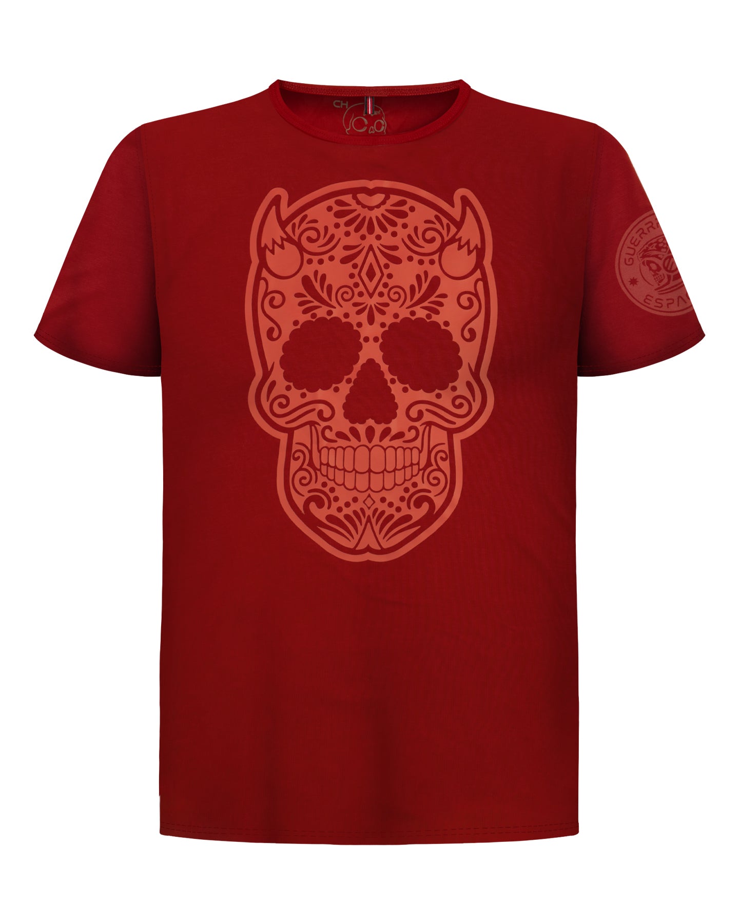 Pieza que irradia pasión y folclore con un toque de picardía mexicana. Confeccionada en un vibrante tono rojo intenso, esta prenda capta la atención de inmediato. En el centro, destaca una calavera de azúcar bellamente detallada, pero con un giro audaz: se adorna con pequeños cuernos, fusionando el arte tradicional del Día de Muertos con la figura de un travieso diablillo.