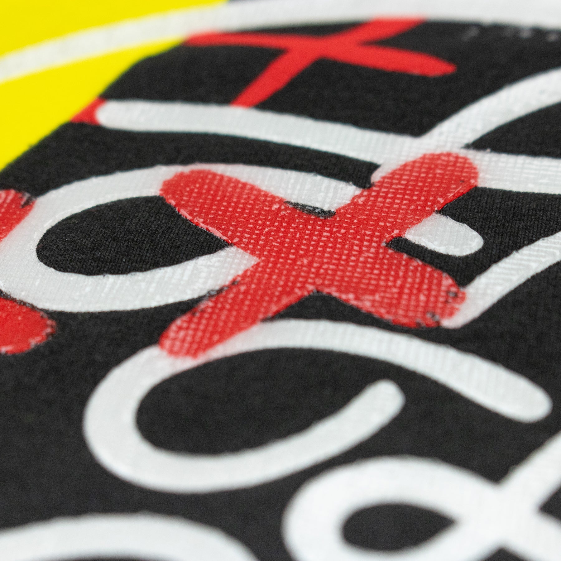 Playera de manga corta con cuello redondo base blanca y estampado en full print con tintas base agua y tinta alta densidad roja en el letrero principal.
