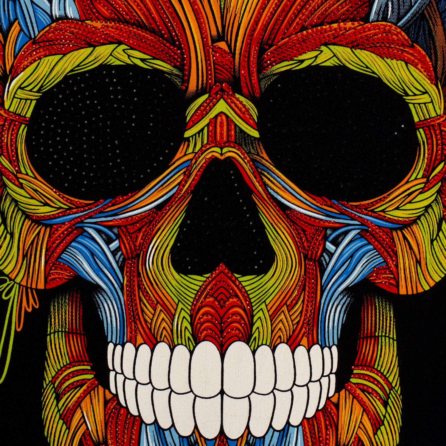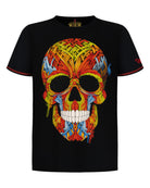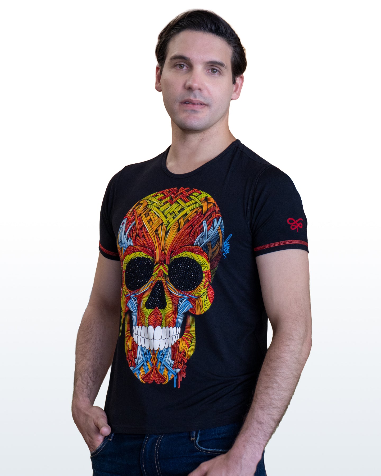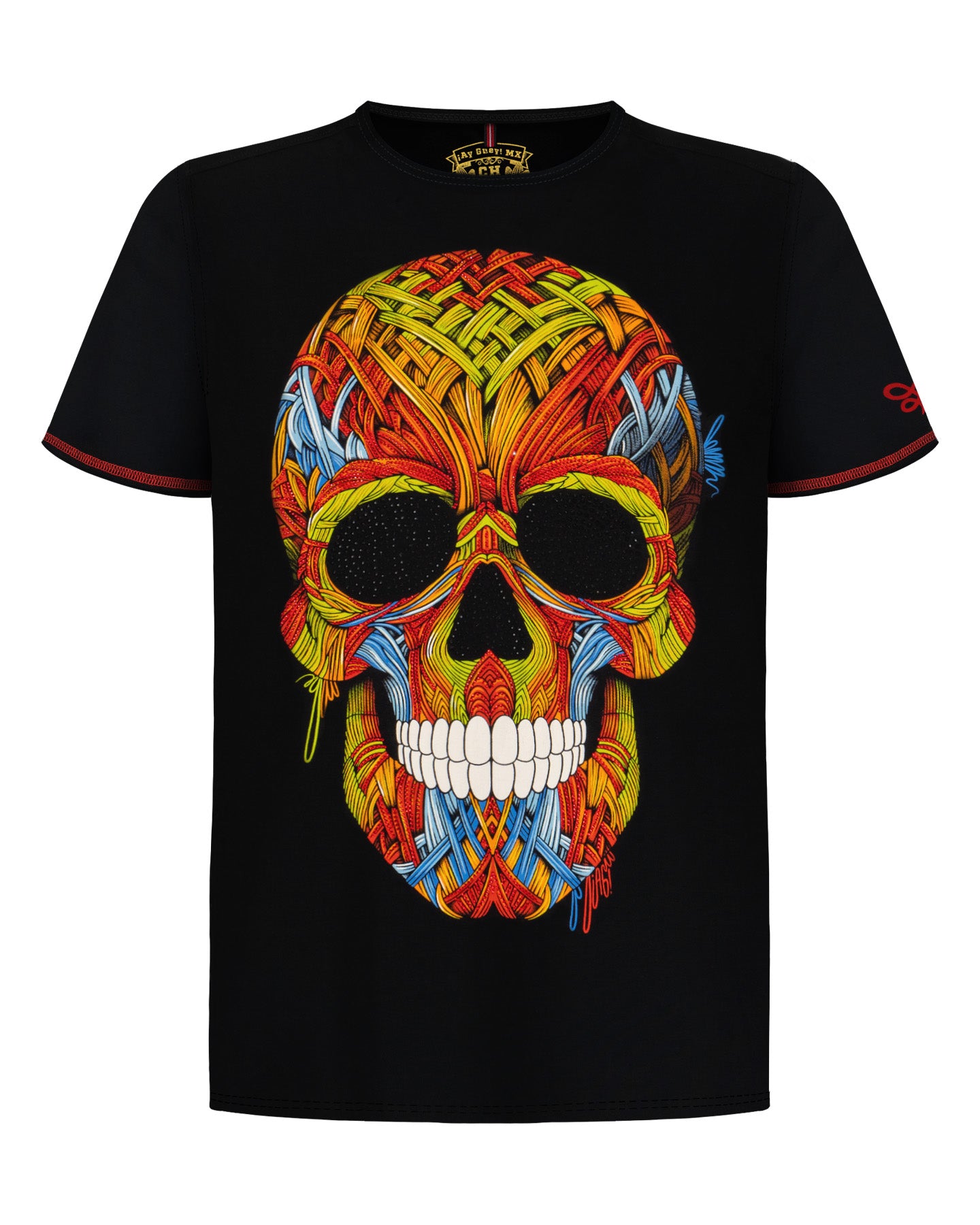 Expresa tu individualidad con esta camiseta negra de corte clásico. Su diseño central muestra una calavera estilizada con un intrincado patrón de líneas entrelazadas en una rica paleta de colores que incluye rojos intensos, amarillos brillantes, azules profundos y verdes vibrantes. Un diseño único que captura la atención.
