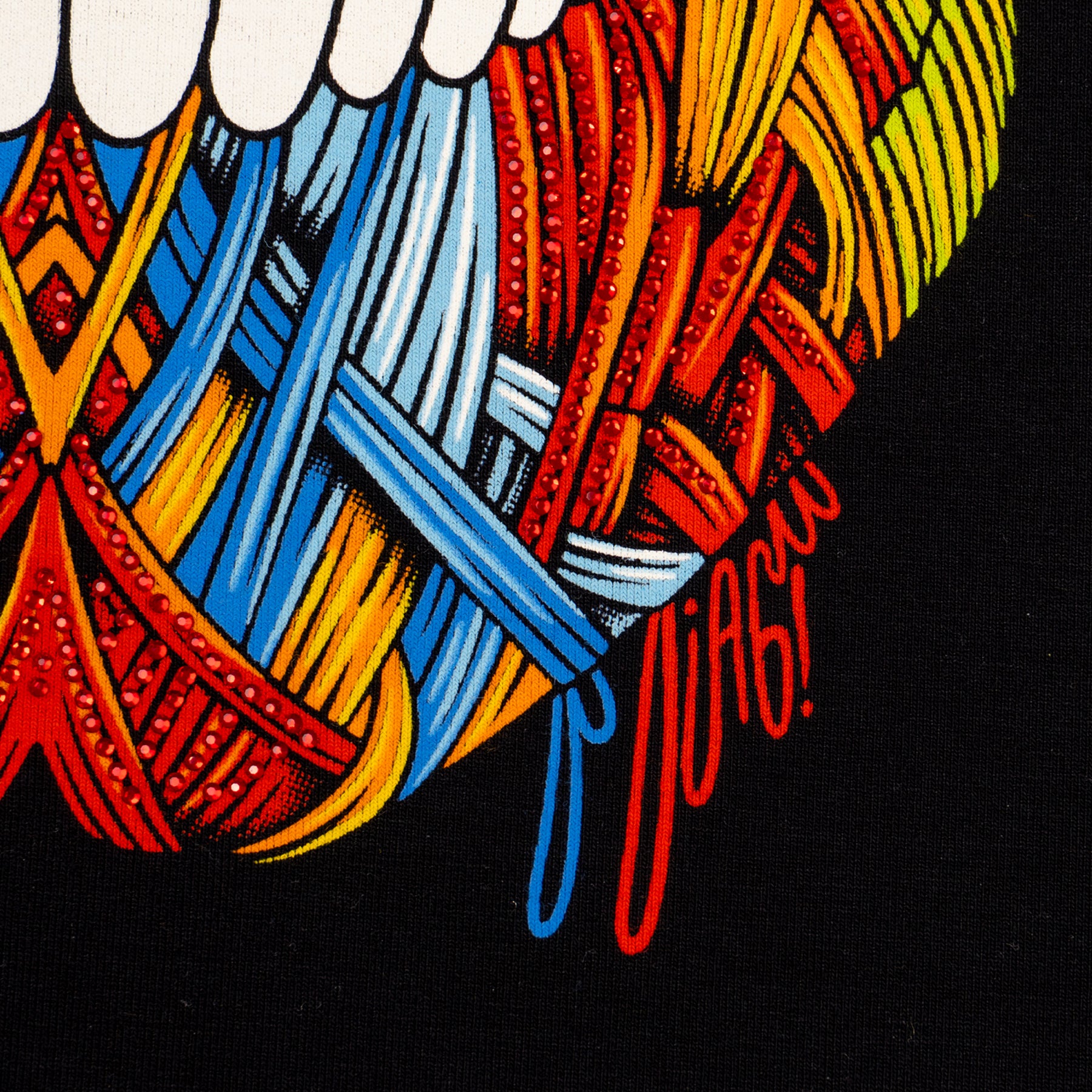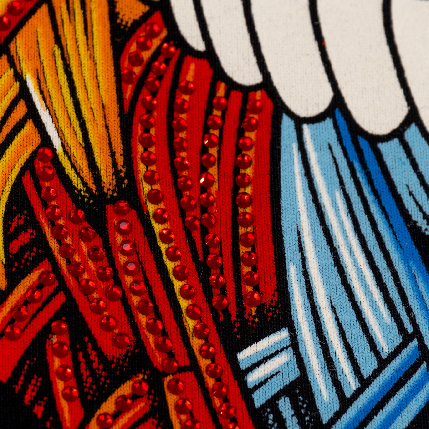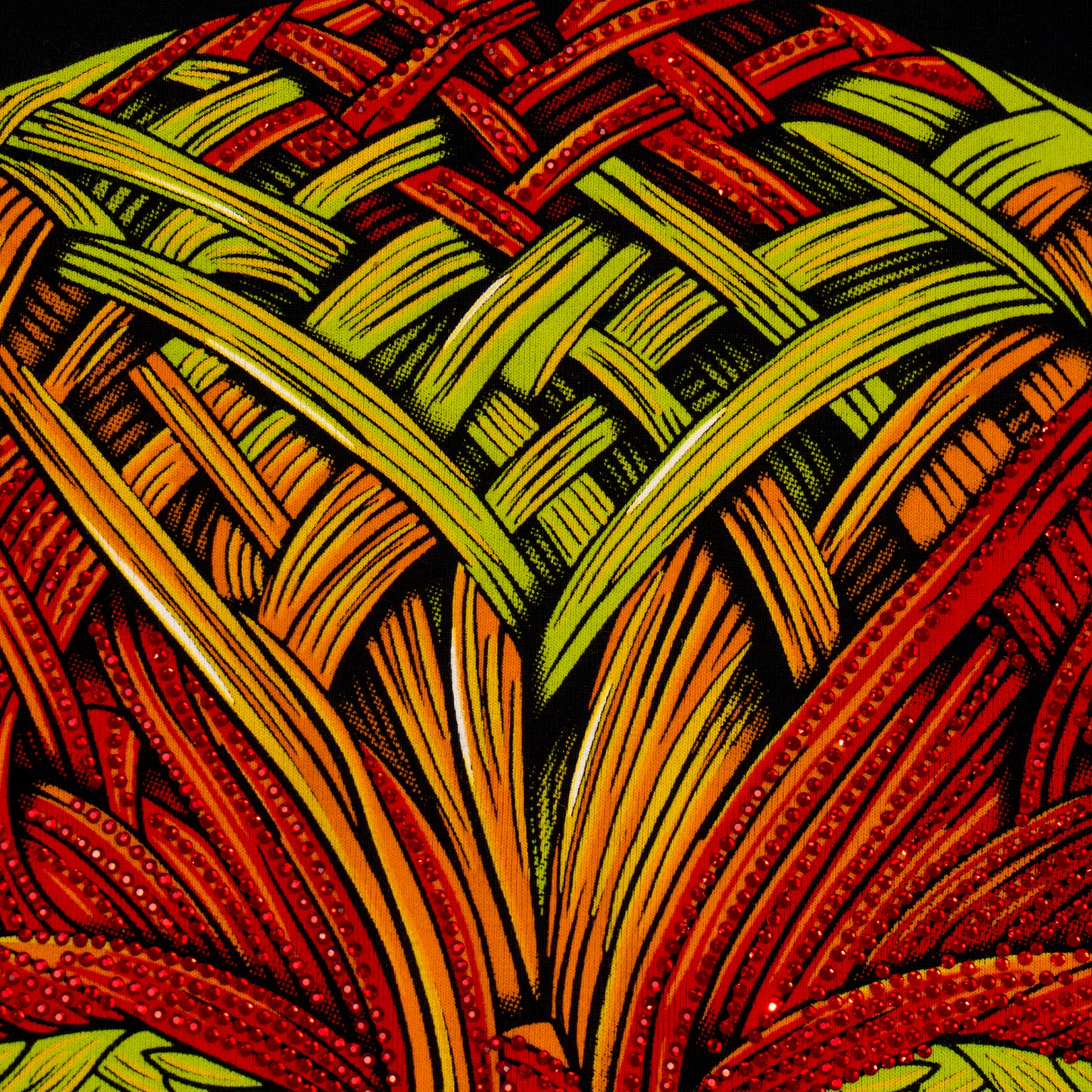 Expresa tu individualidad con esta camiseta negra de corte clásico. Su diseño central muestra una calavera estilizada con un intrincado patrón de líneas entrelazadas en una rica paleta de colores que incluye rojos intensos, amarillos brillantes, azules profundos y verdes vibrantes. Un diseño único que captura la atención.