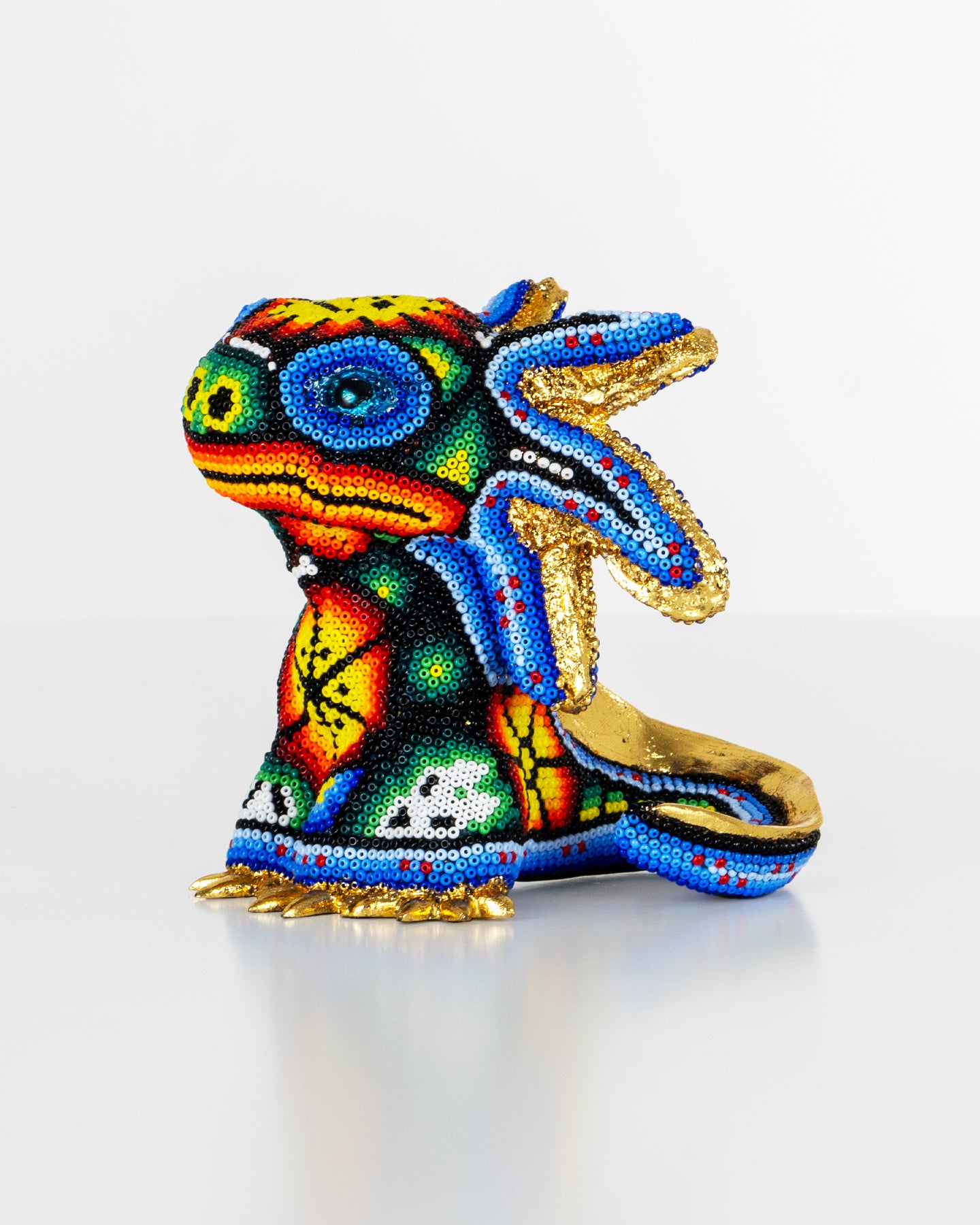 Esta figura de Ajolote fusiona la visión contemporánea de Menchaca Studio con el legado espiritual del pueblo Wixárika, quienes plasman visiones sagradas mediante miles de cuentas de cristal. Cada pieza es una obra de arte única e irrepetible, por lo que el diseño y los colores varían siempre; aunque la base de molde se mantiene constante, cada intervención es un objeto original.