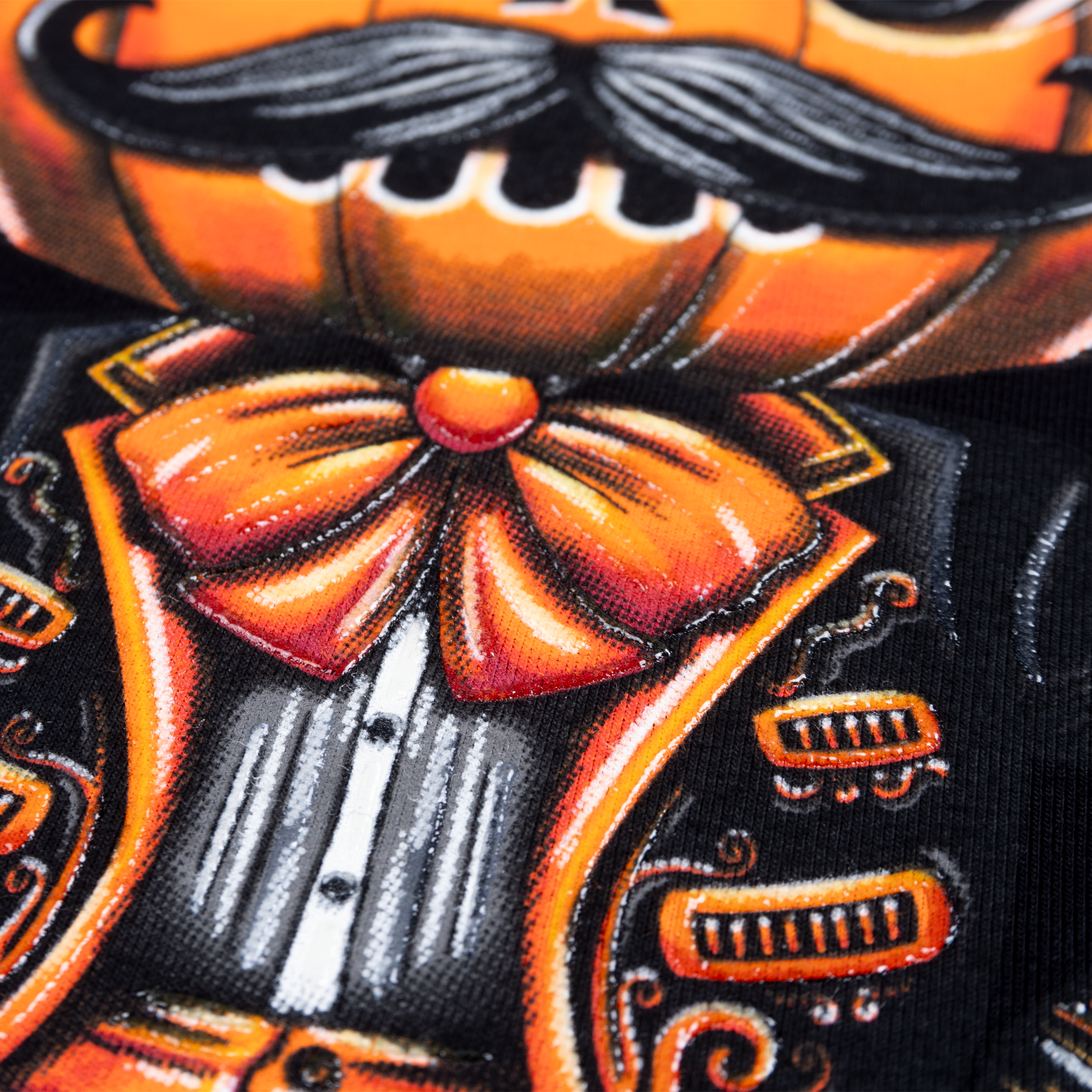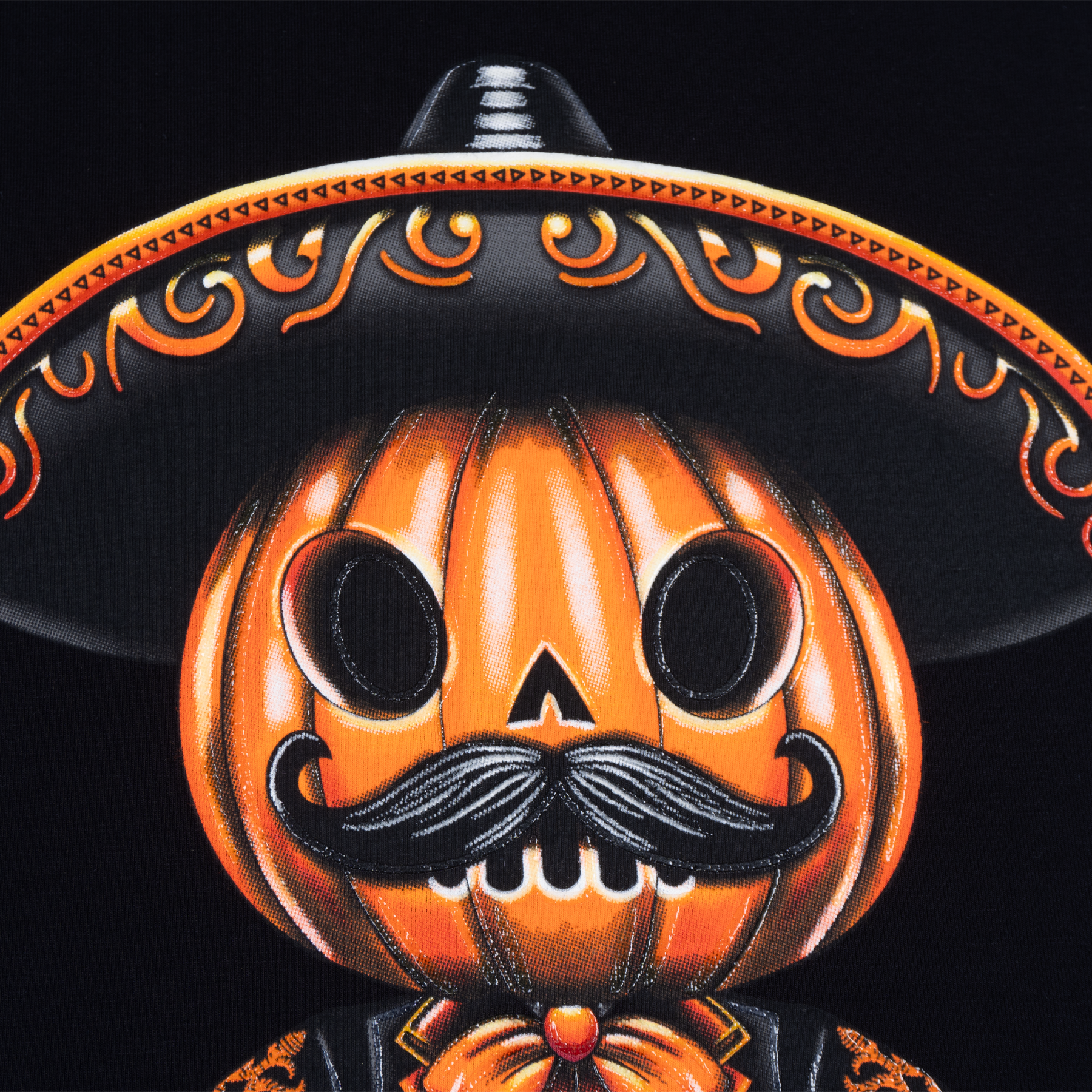 Como una mezcla entre culturas, surge de combinar un atuendo muy mexicano mariachi con la clásica calabaza de Halloween, que será nuestra invitada especial en esta temporada para el día de muertos, indudablemente las dos culturas- la mexicana y americana- estamos mas que fusionadas con un gran historial por la cercanía de ambos países.