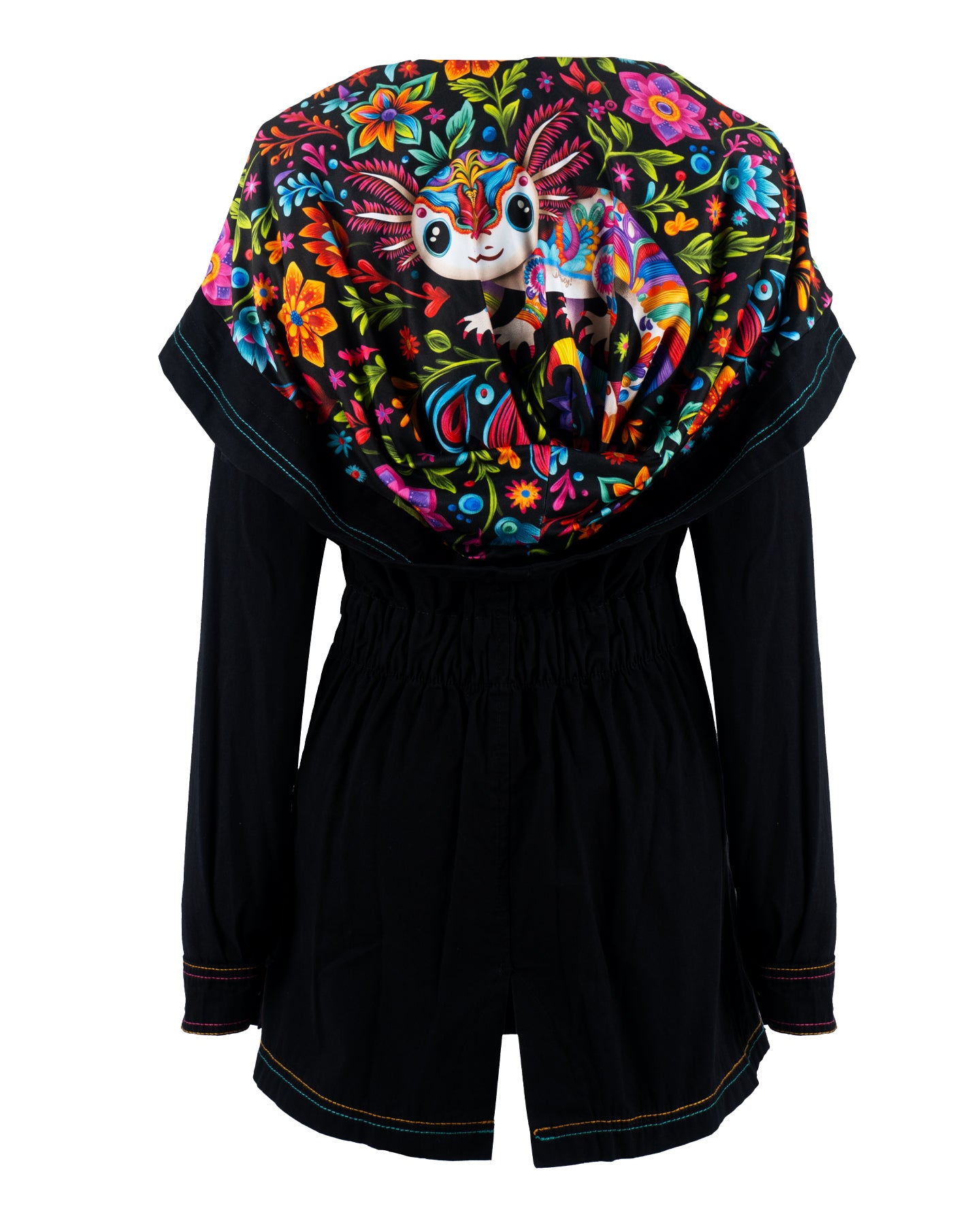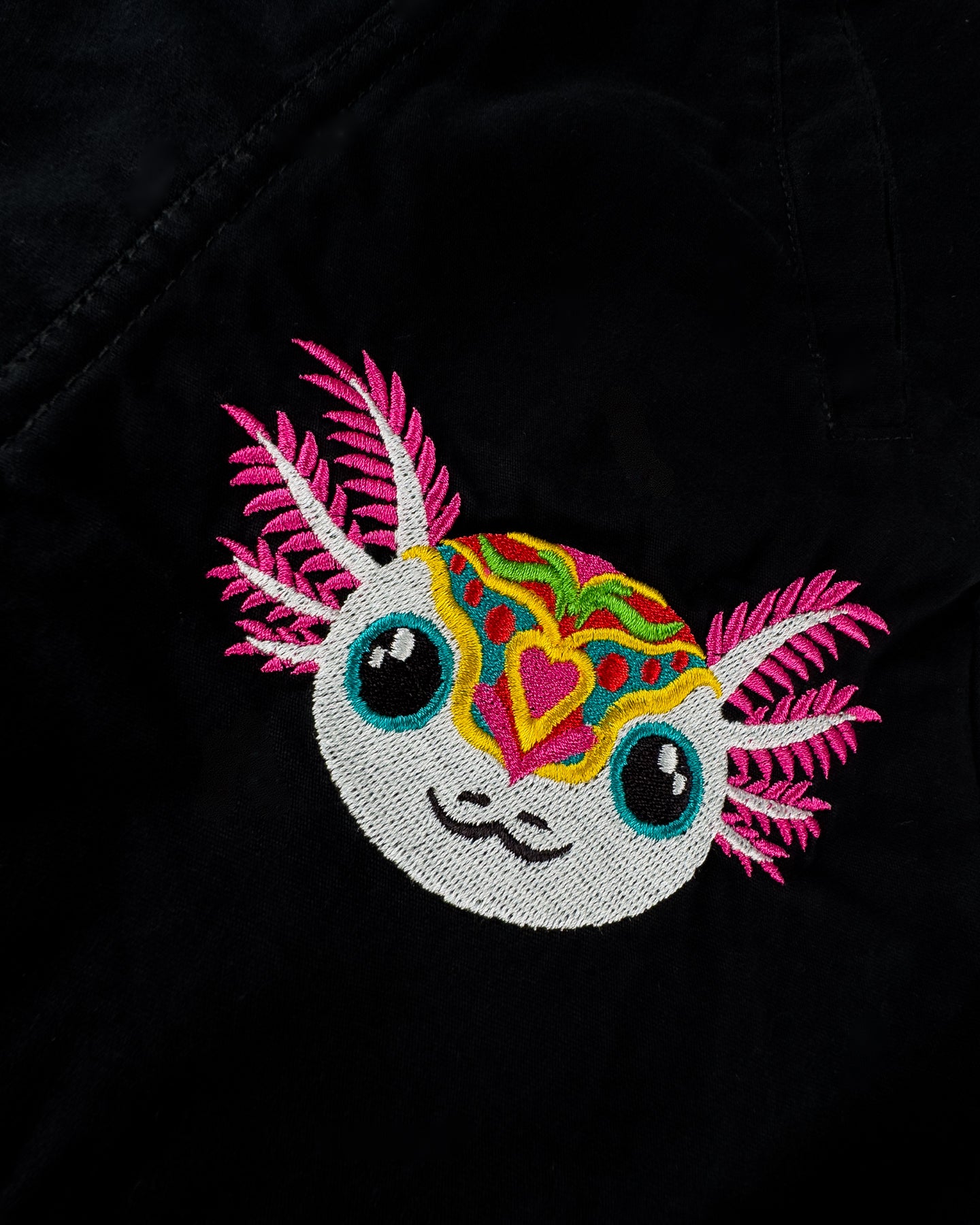Diseño inspirado en el ajolote místico de México y el vibrante arte de los bordados tradicionales.