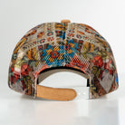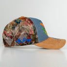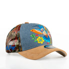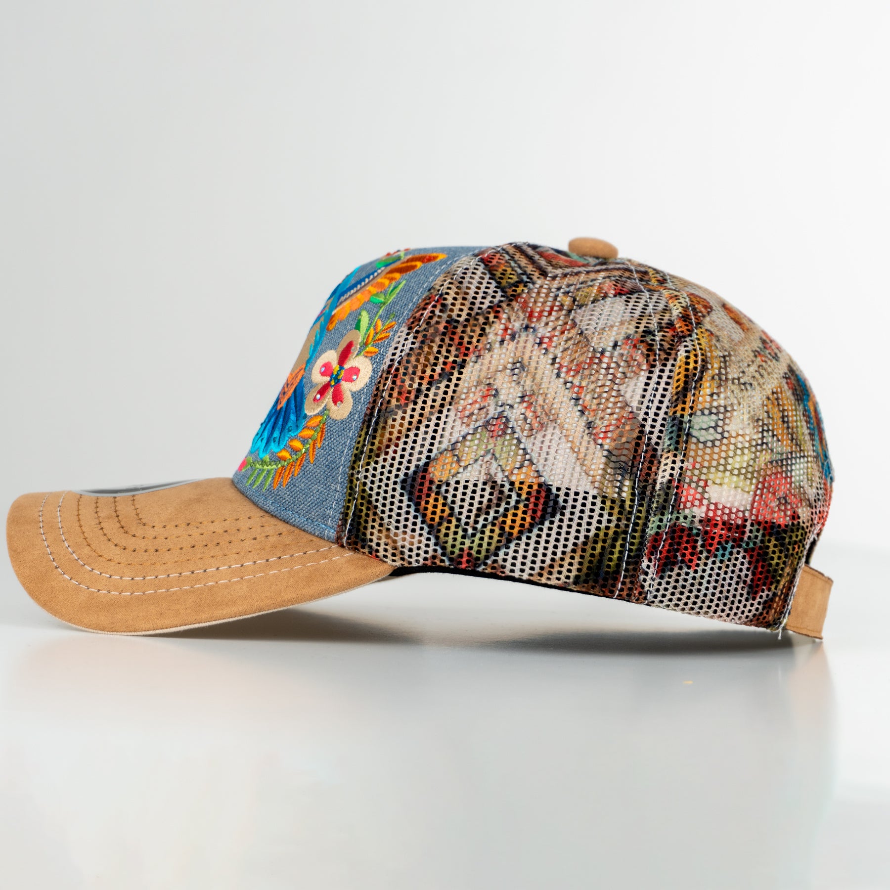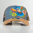 Gorra tipo trucker con paneles de mezclilla y malla estampada. Presenta un vibrante bordado de colibrí y flores. Visera de gamuza color caramelo. Estilo artesanal con ajuste trasero.