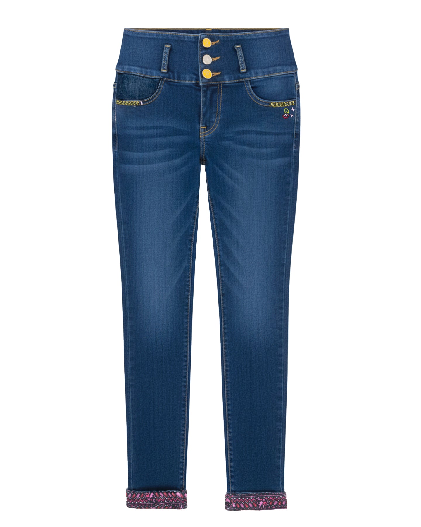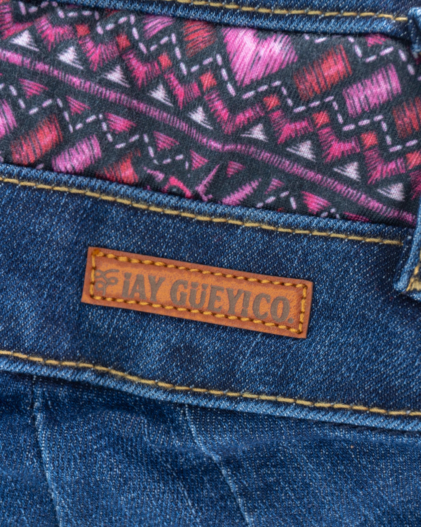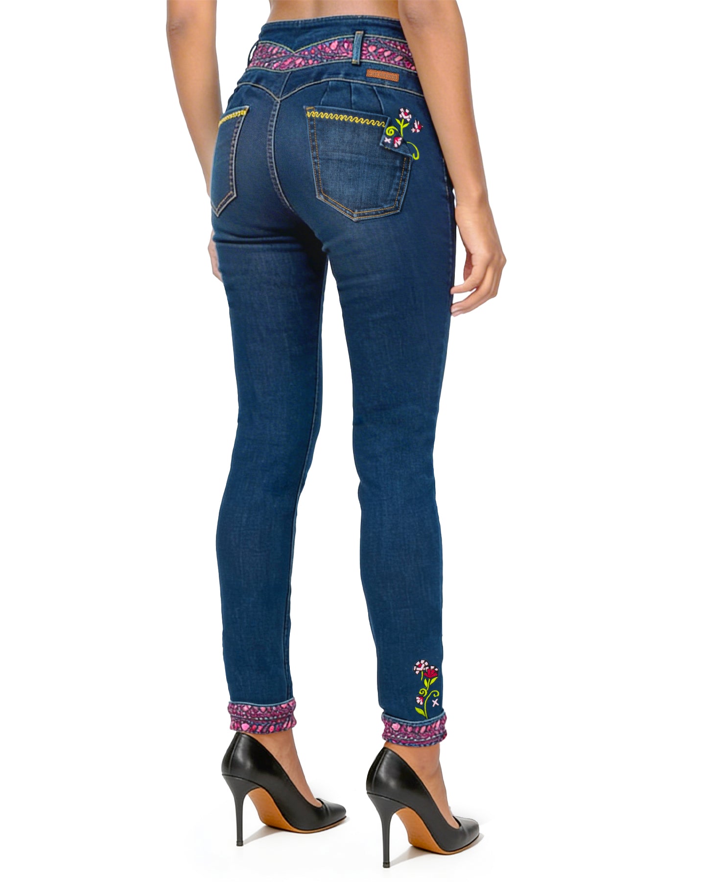 Los jeans Flor-cita integran bordados artesanales y una triple botonadura metálica que estiliza la figura con un ajuste de tiro alto. El denim de lavado profundo destaca por sus costuras en contraste y un ruedo interno estampado que revela detalles florales al doblarse, aportando un toque lúdico a cada paso.