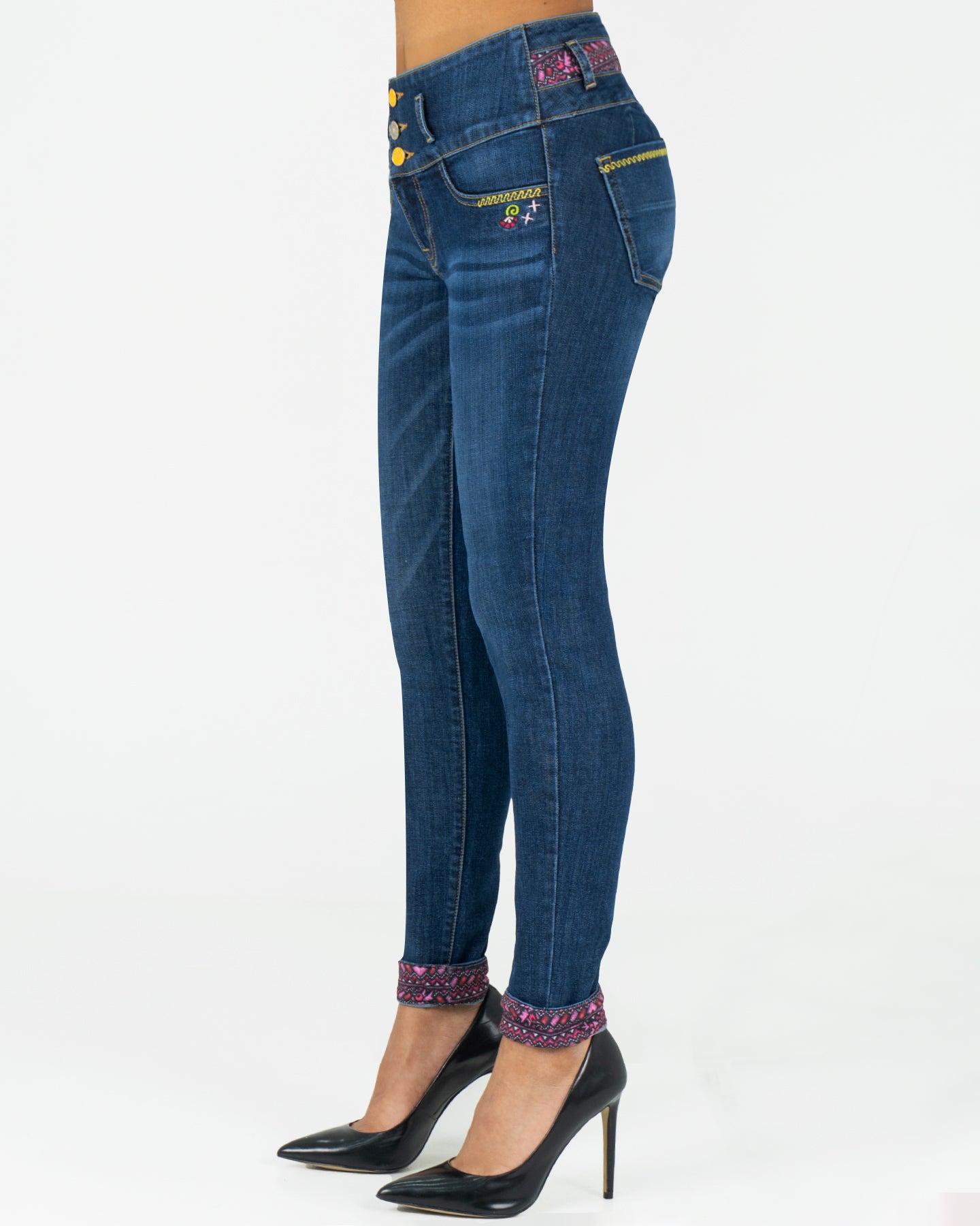 Jeans Push-Up color azul índigo de mezclilla estampada con stretch.