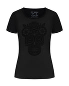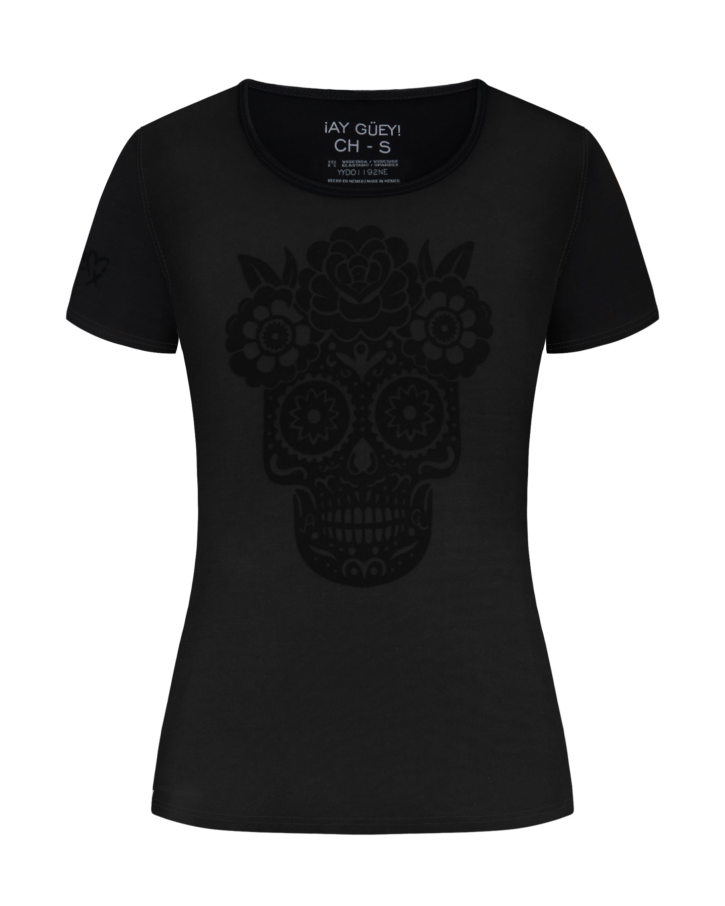 Playera estampada con Flock negro sobre negro para mujer - Modelo KALA FLORES