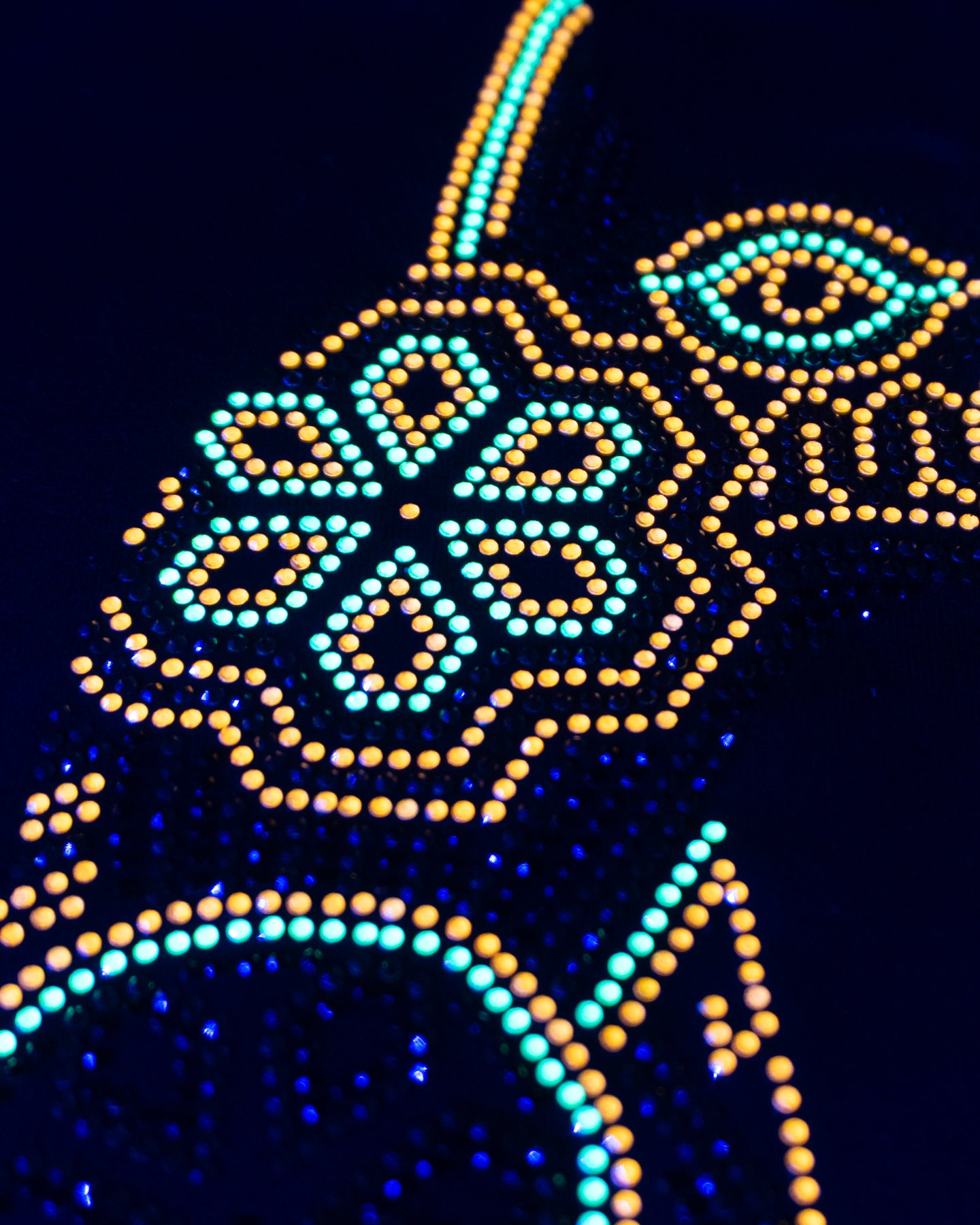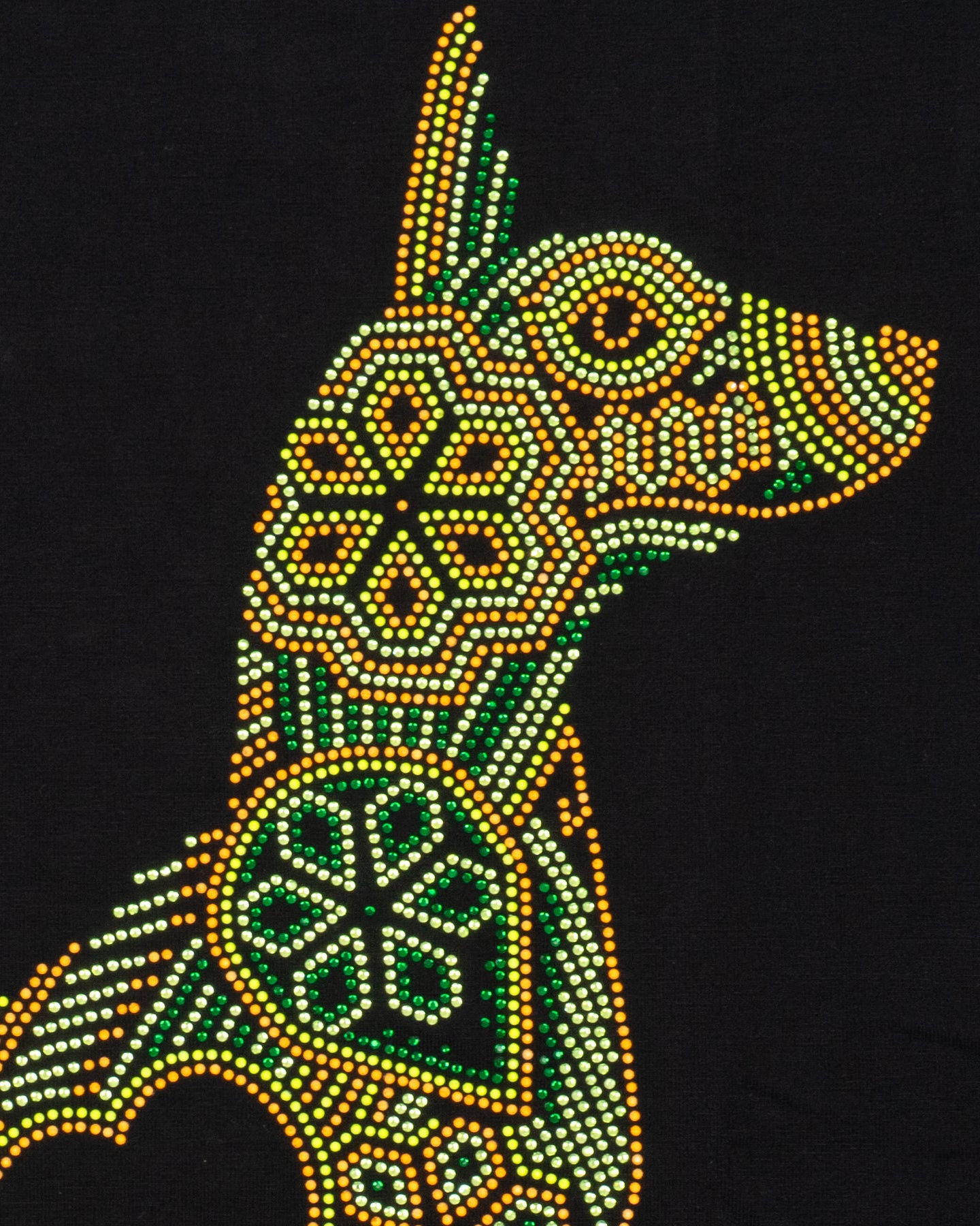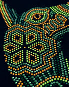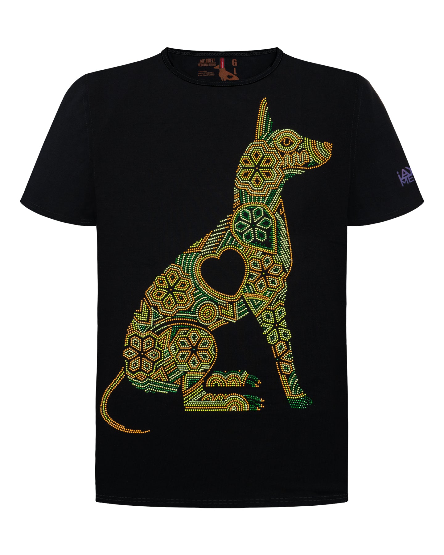 Esta playera plasma la silueta elegante de un Xoloitzcuintle, el guardián ancestral. Su diseño está completamente cubierto de piedra brillante, creando un mosaico deslumbrante que capta todas las miradas. El toque maestro reside en los detalles en color verde, que no son una piedra común, sino piedra neón que se ilumina intensamente bajo la luz UV o negra, dándole a tu estilo un efecto electrizante en cualquier evento nocturno.