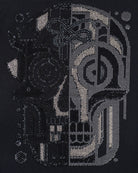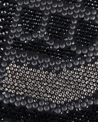 Corte regular en tono negro, pespunte reforzado en el dobladillo. Destaca un diseño central inspirado en el muralista mexicano, elaborado con aplicaciones de pedrería en contraste negro y plata.