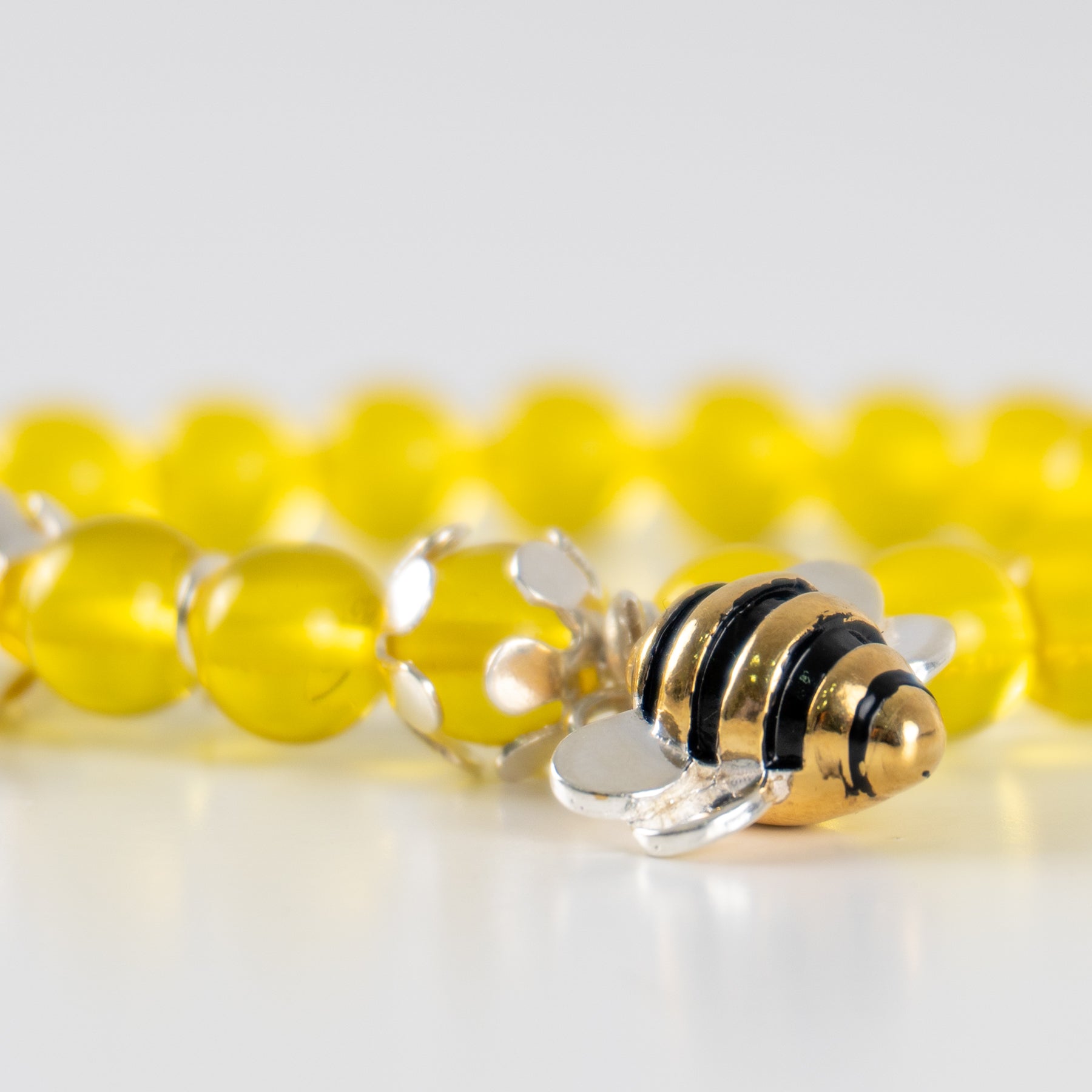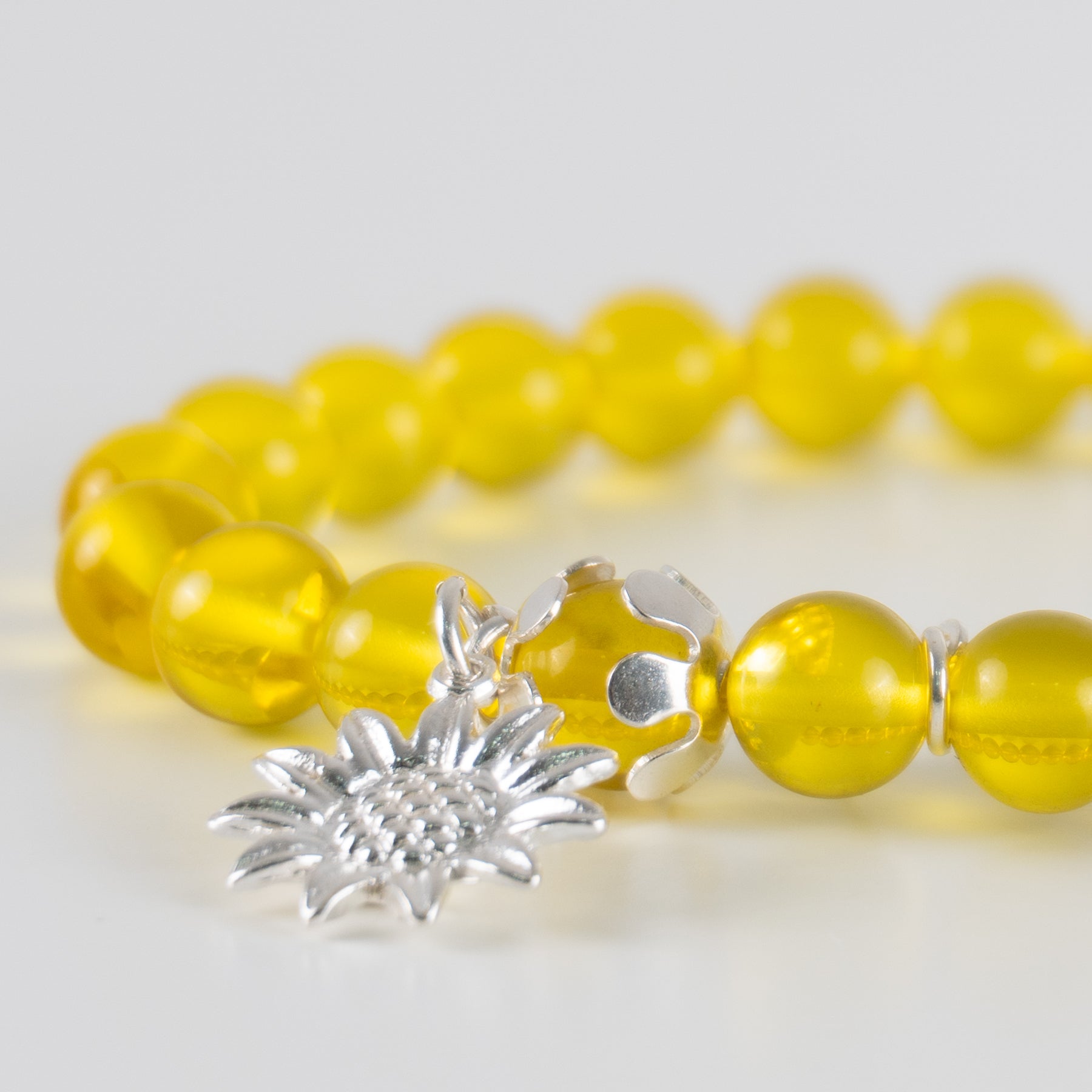 Descubre la magia de la naturaleza con nuestra encantadora pulsera artesanal. Hecha con cuentas redondas de ámbar translúcidas en un vibrante tono amarillo, esta pieza evoca la calidez del sol y la energía positiva del girasol y la abeja.