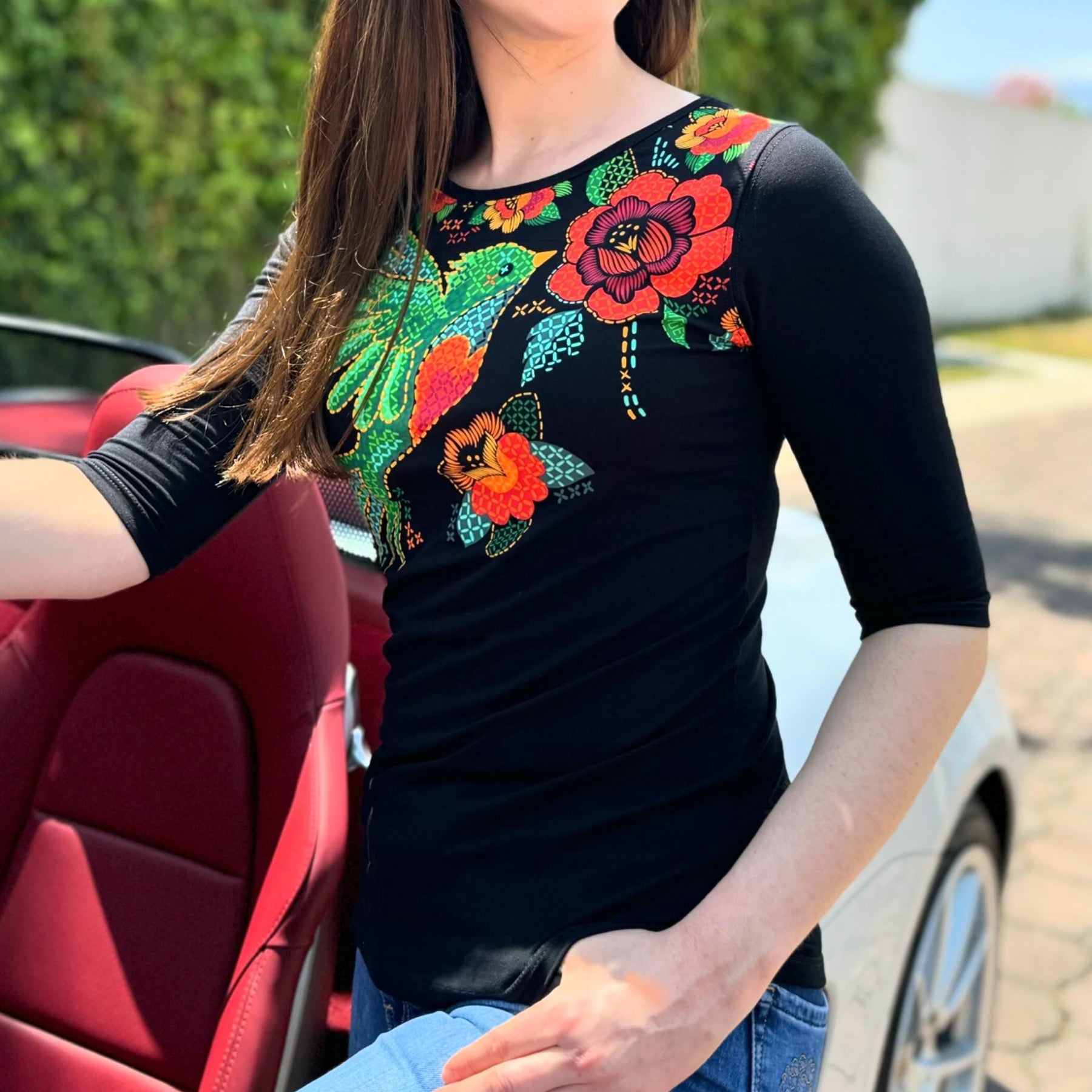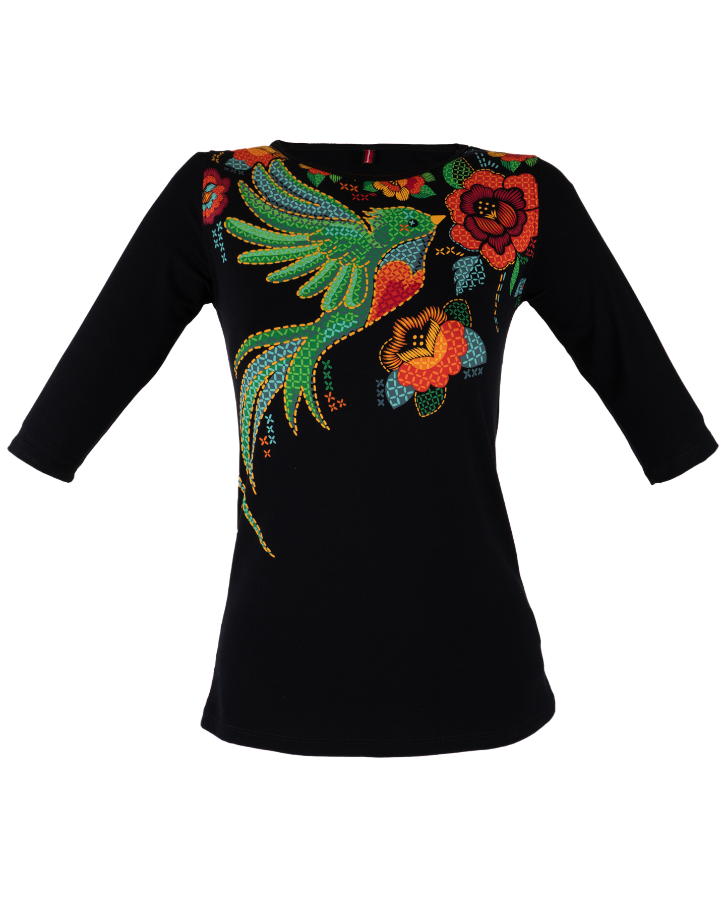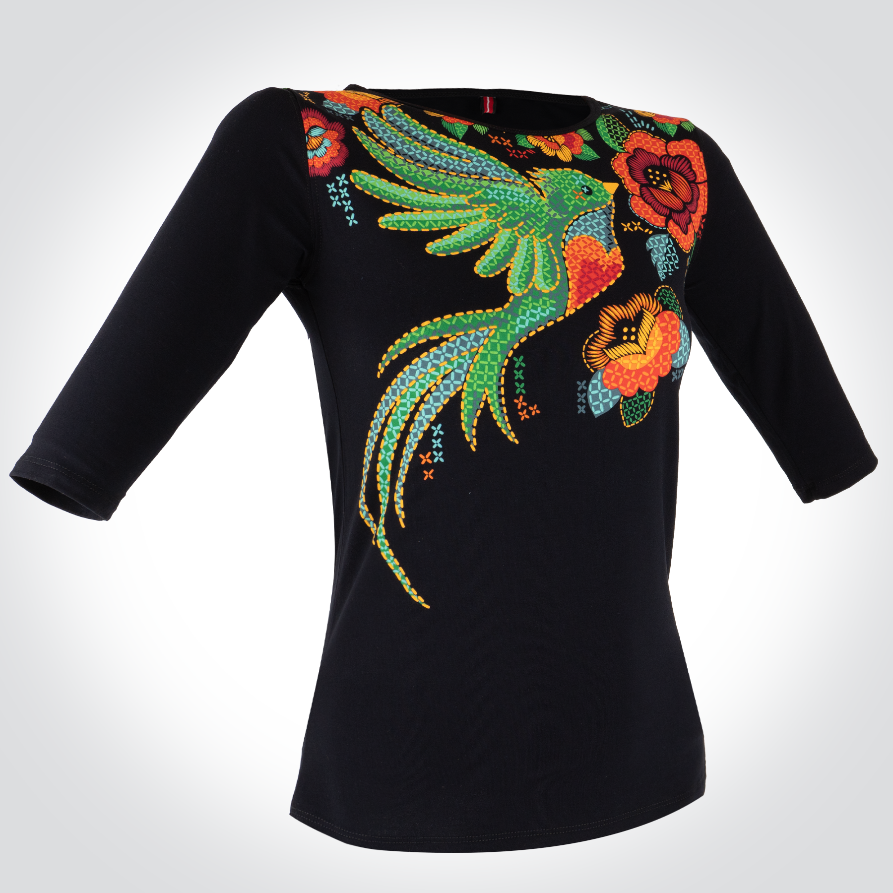 Playera de dama con cuello redondo y manga 3/4, el estampado se extiende hasta los hombros. En la parte frontal tiene a un quetzal y flores rojas emulando el bordado en punto de cruz. Inspirada en el brillo de los colores del plumaje del quetzal y en la naturaleza del sureste mexicano.
