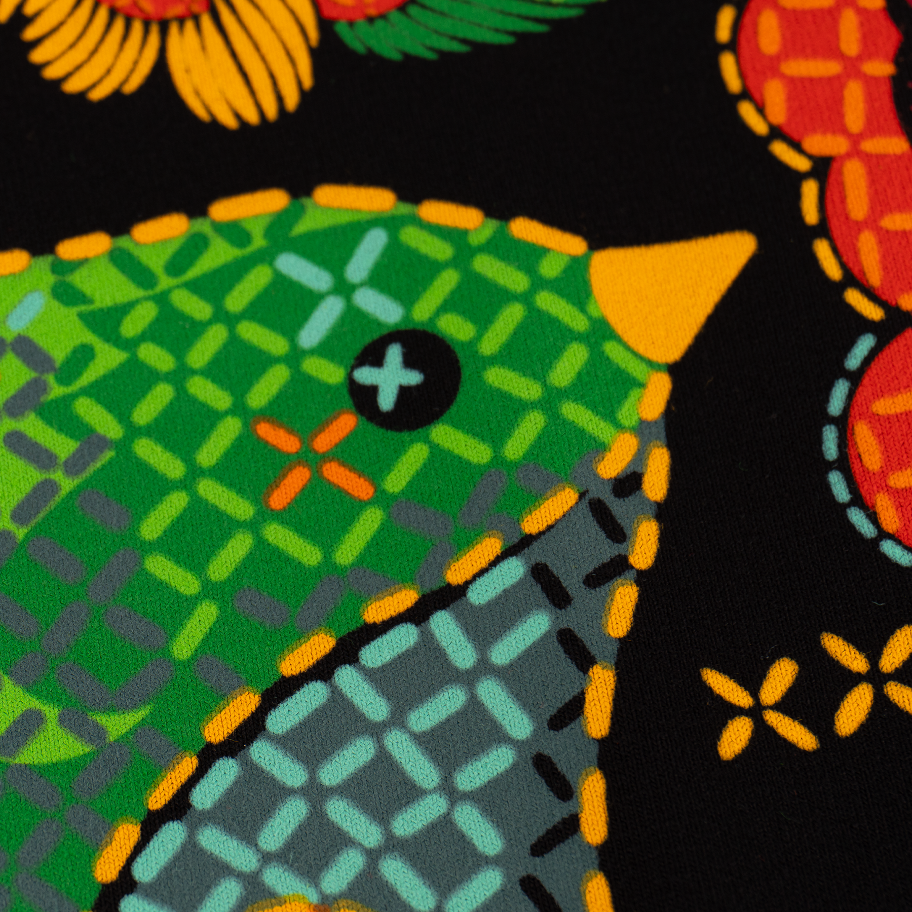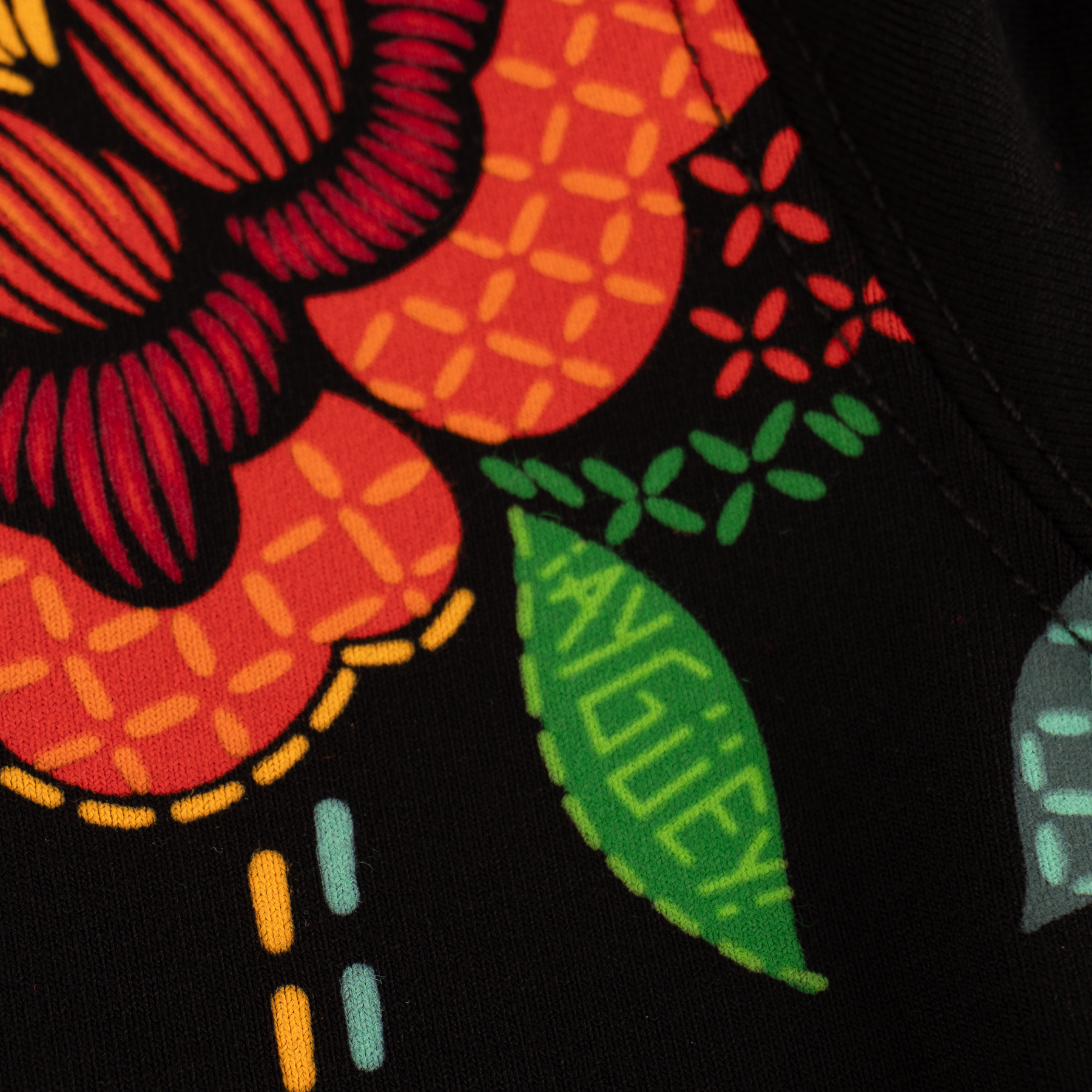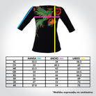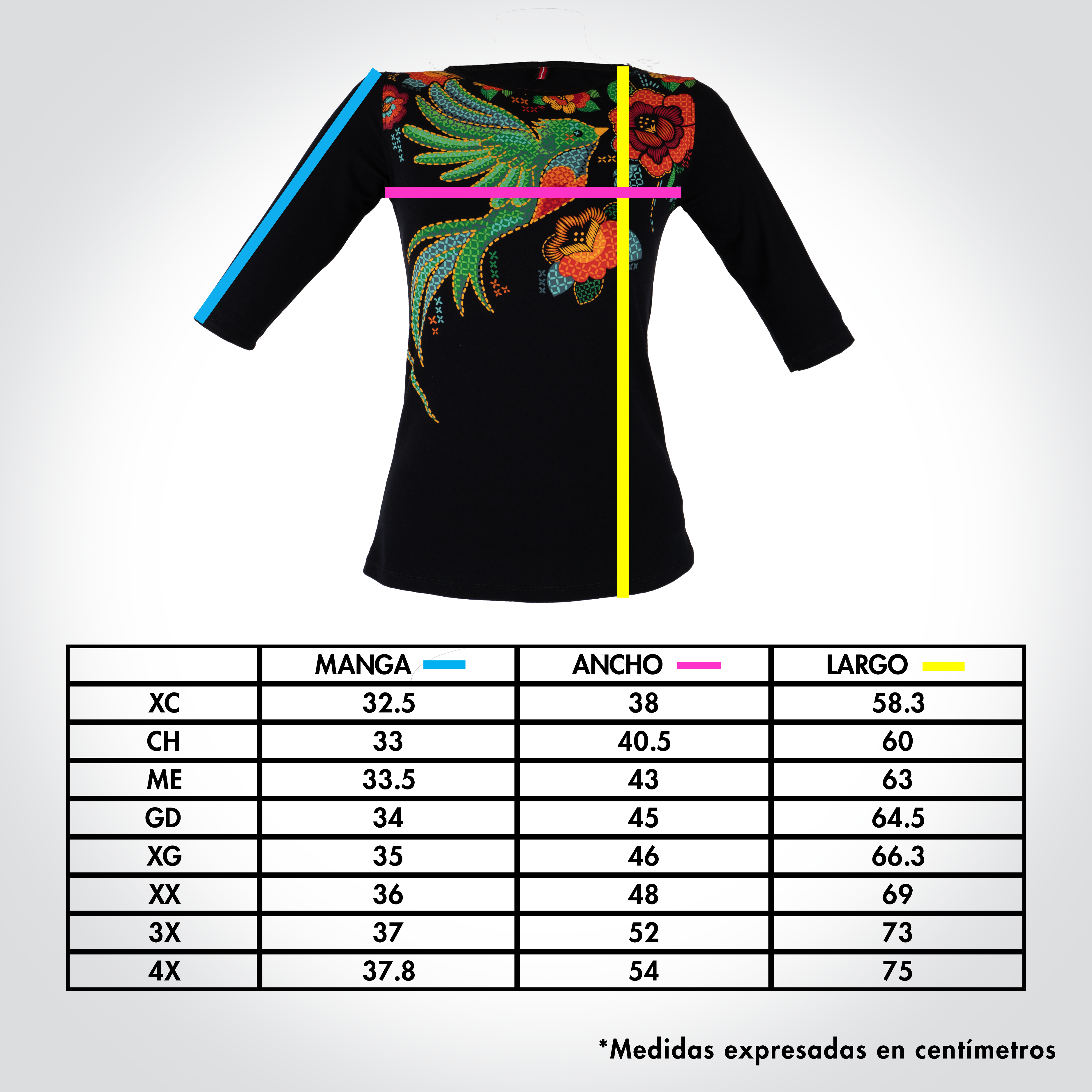 Playera de dama con cuello redondo y manga 3/4, el estampado se extiende hasta los hombros. En la parte frontal tiene a un quetzal y flores rojas emulando el bordado en punto de cruz. Inspirada en el brillo de los colores del plumaje del quetzal y en la naturaleza del sureste mexicano.